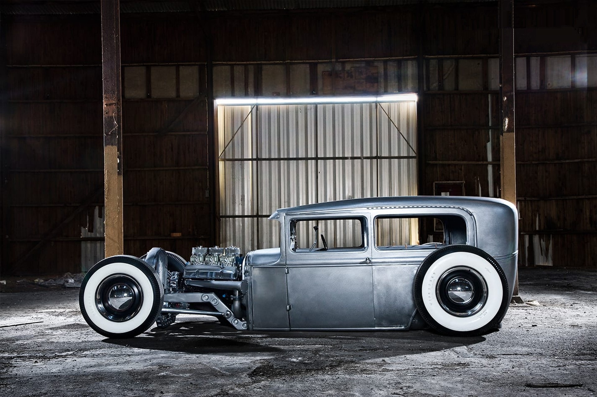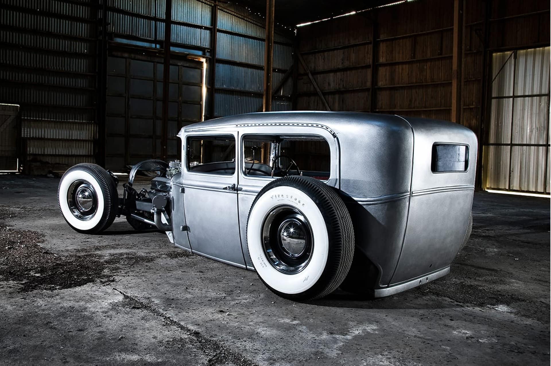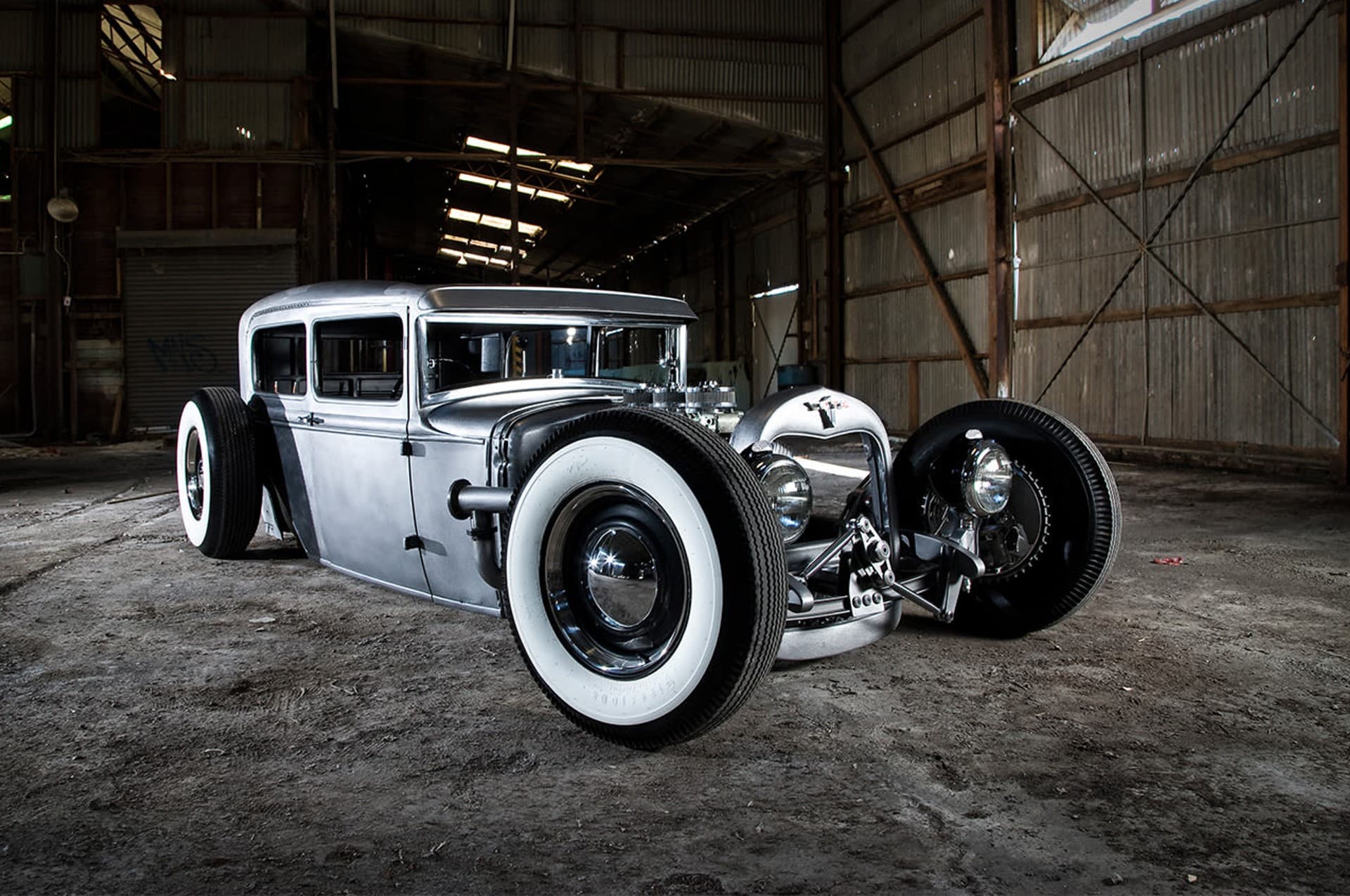 -“Mon Hot-Rod Tudor a commencé sa vie en tant que Pick-up Essex de 1928 ! Mais c’était à l’origine une carrosserie de berline qui avait été découpé en Pick-up par un propriétaire précédent. Tout est direct revenu à l’argent que je n’avais plus, car perdu dans les bars à putes, donc je n’en avais plus assez pour me construire un modèle “A” ! J’ai opté pour faire un “Schmick”. C’est un est euphémisme de la décennie, un mélange super claqué d’éléments traditionnels”…