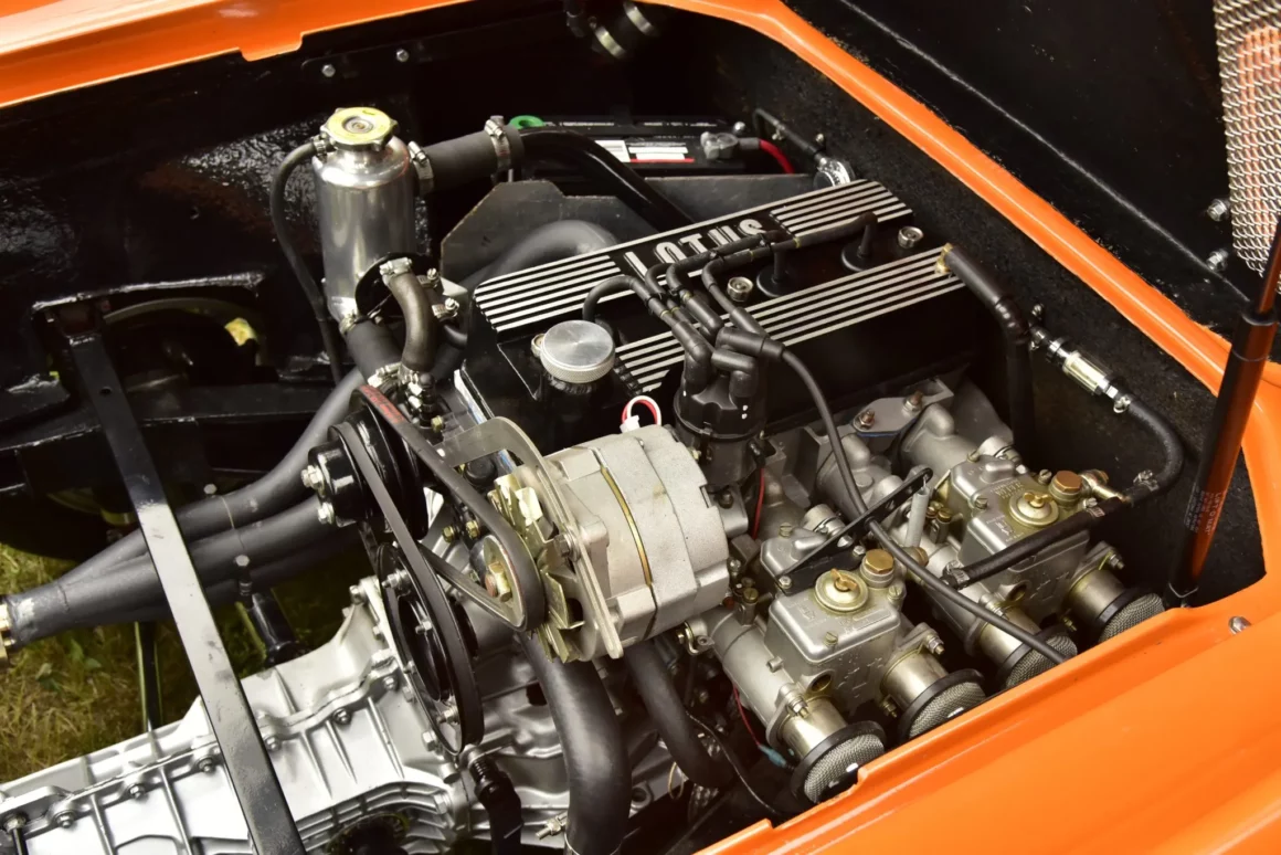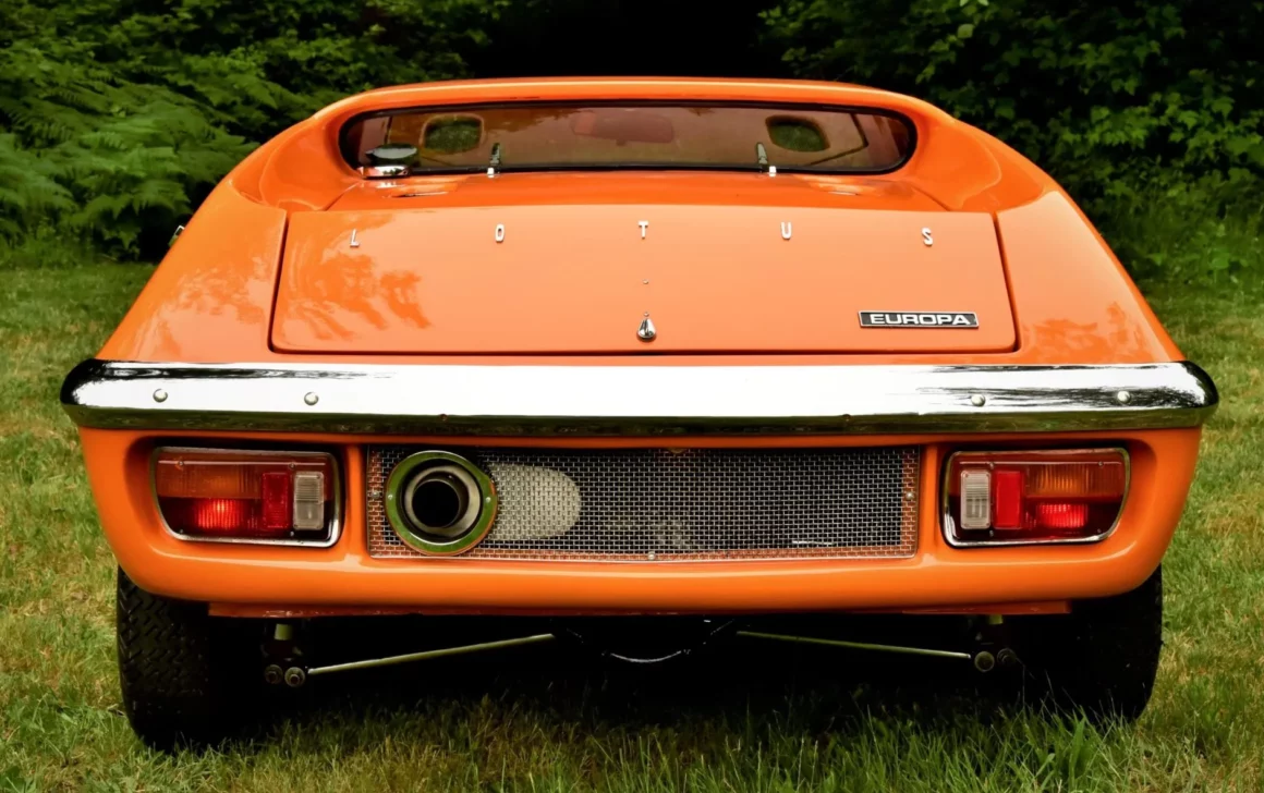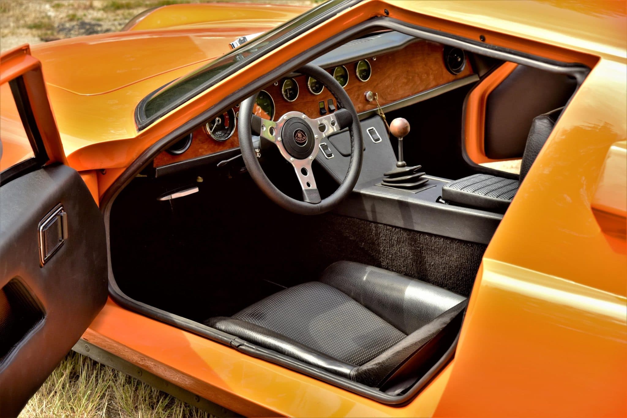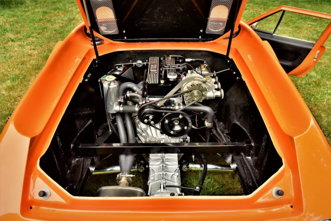 En 1970, date de la sortie de cette S2, Lotus comptait 4 titres de champion du monde. Ils vont se faire de plus en plus rares avant que l’écurie disparaisse en 2015. Cette Lotus Europa S2 1970 orange tanger sur une sellerie en vinyle noir est propulsée par un Renault quatre cylindres en ligne 1.565 cc équipé d’une culasse à flux transversal, de deux carburateurs Weber 40 DCOE, d’un collecteur à longs tubes, d’un système d’allumage PerTronix. Le silencieux d’échappement est un Magnaflow. La boîte-pont manuelle Renault 336/26dispose de quatre vitesses, les jantes sont des JBW Minilight de 13 pouces montées de pneus Pirelli Cinturato CN175 70/36. L’essuie-glace est monolame. Les freins avant sont à disque et arrière sont des tambours. Voilà, c’est fini !