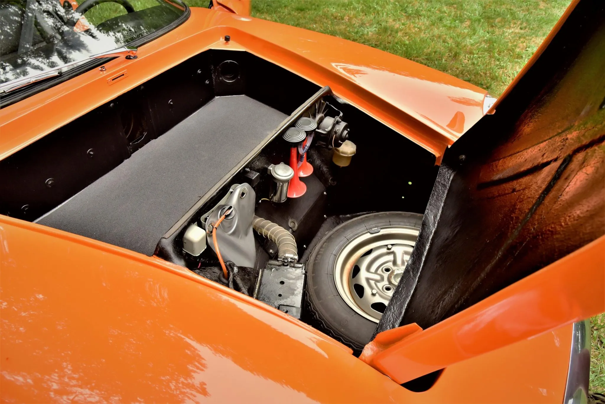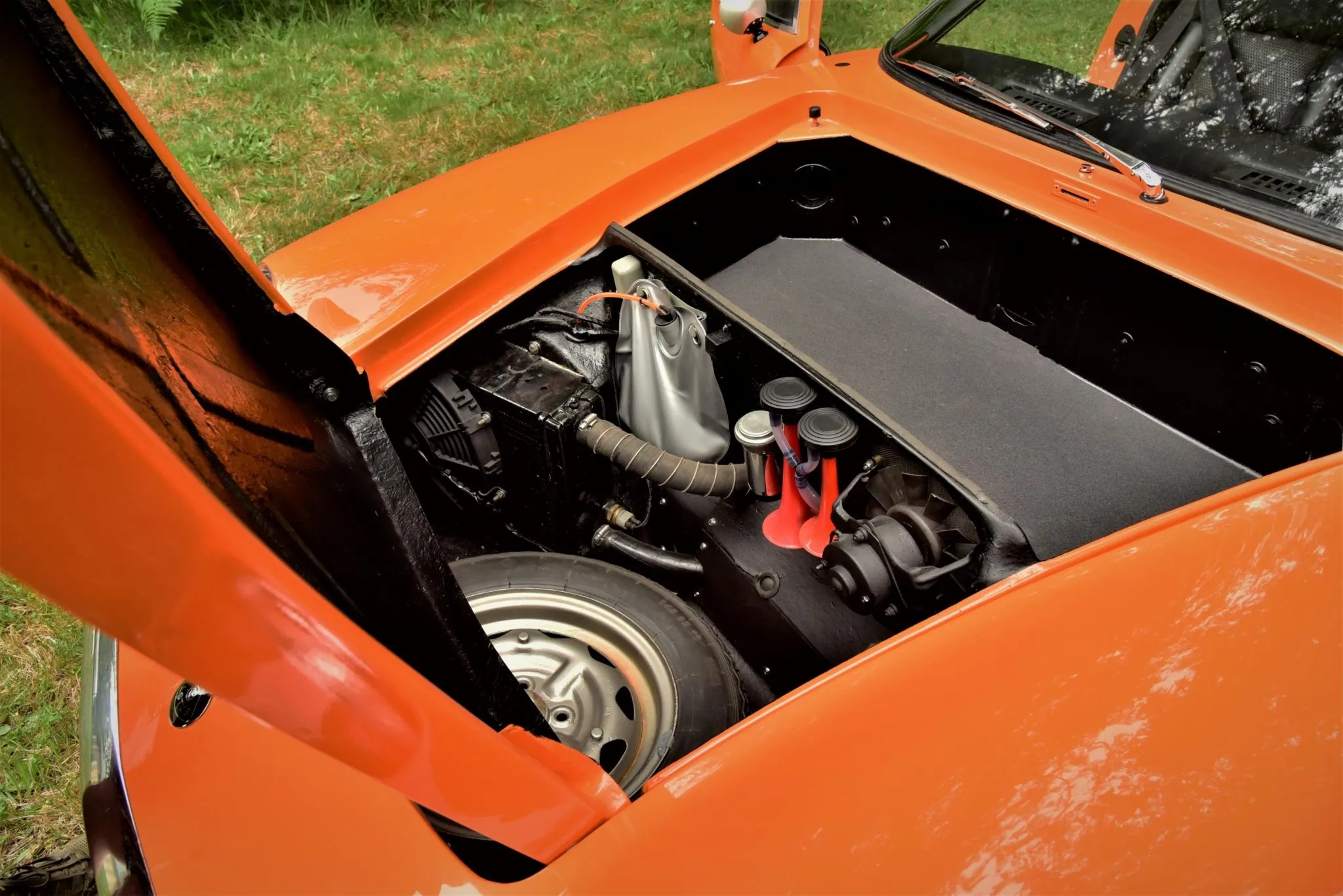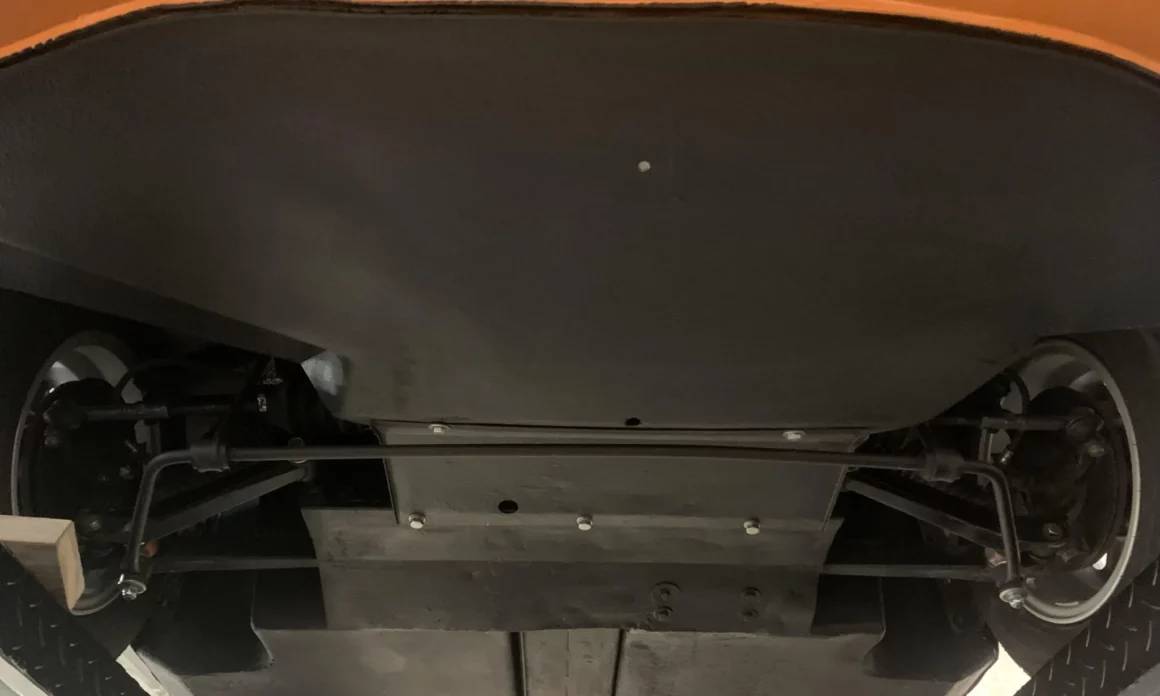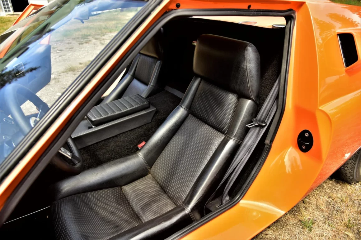 En 1970, date de la sortie de cette S2, Lotus comptait 4 titres de champion du monde. Ils vont se faire de plus en plus rares avant que l’écurie disparaisse en 2015. Cette Lotus Europa S2 1970 orange tanger sur une sellerie en vinyle noir est propulsée par un Renault quatre cylindres en ligne 1.565 cc équipé d’une culasse à flux transversal, de deux carburateurs Weber 40 DCOE, d’un collecteur à longs tubes, d’un système d’allumage PerTronix. Le silencieux d’échappement est un Magnaflow. La boîte-pont manuelle Renault 336/26dispose de quatre vitesses, les jantes sont des JBW Minilight de 13 pouces montées de pneus Pirelli Cinturato CN175 70/36. L’essuie-glace est monolame. Les freins avant sont à disque et arrière sont des tambours. Voilà, c’est fini !