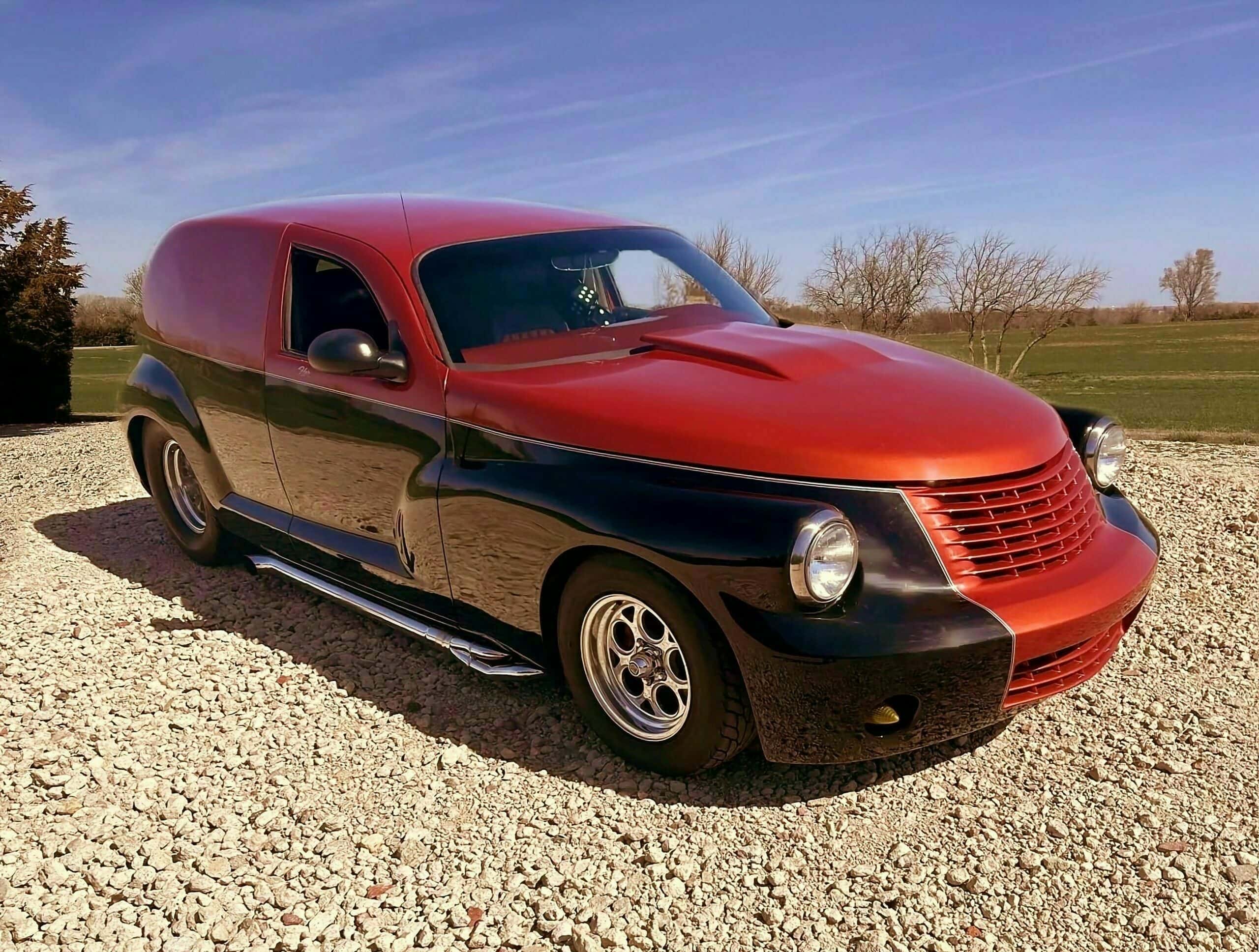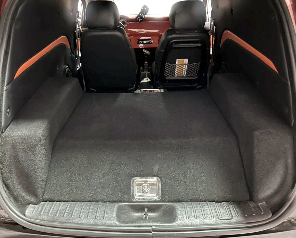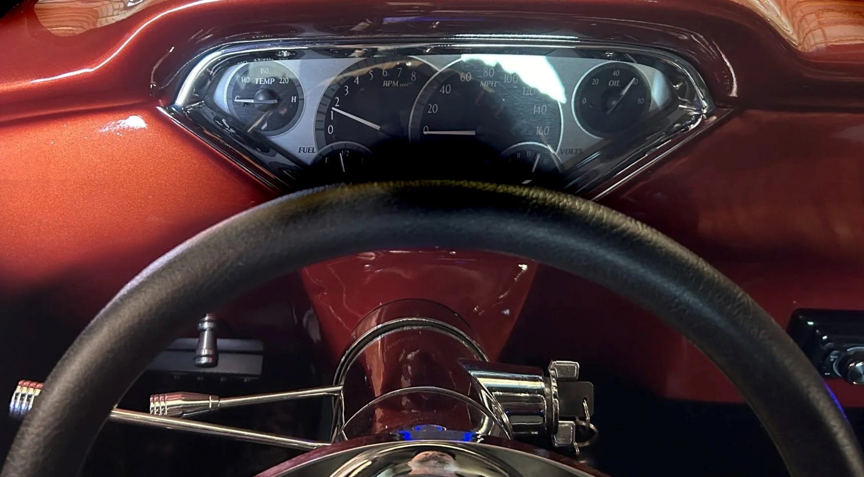 Des freins à disque ventilés aux quatre roues fournissent de quoi stopper, et l’habitacle est équipé d’un levier de vitesses B&M, d’un volant en billette d’alu, d’une instrumentation Dakota Digital, de sièges baquets et d’un système audio. Les phares et les feux arrière proviennent respectivement d’une Chevrolet 1953 et d’une Cadillac 1959. Le hayon et les ailes arrière ont été modifiées pour s’adapter à la nouvelle hauteur de caisse et à la nouvelle largeur des pneus.