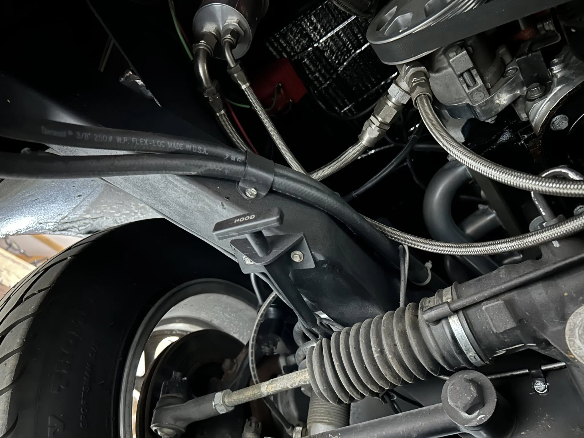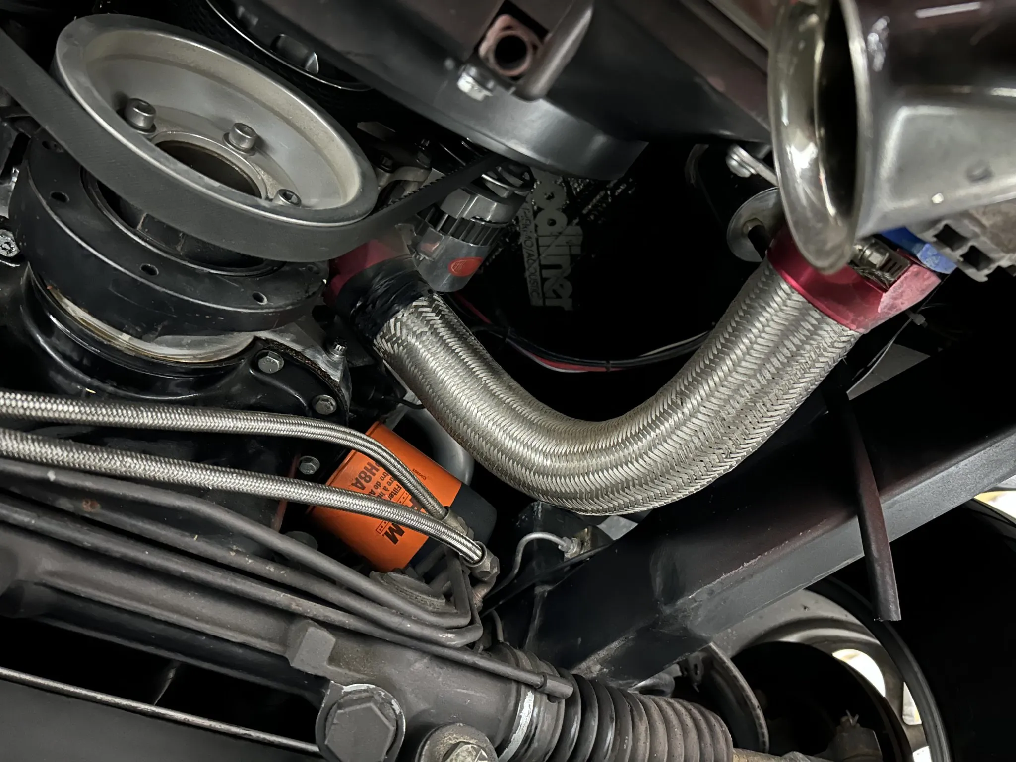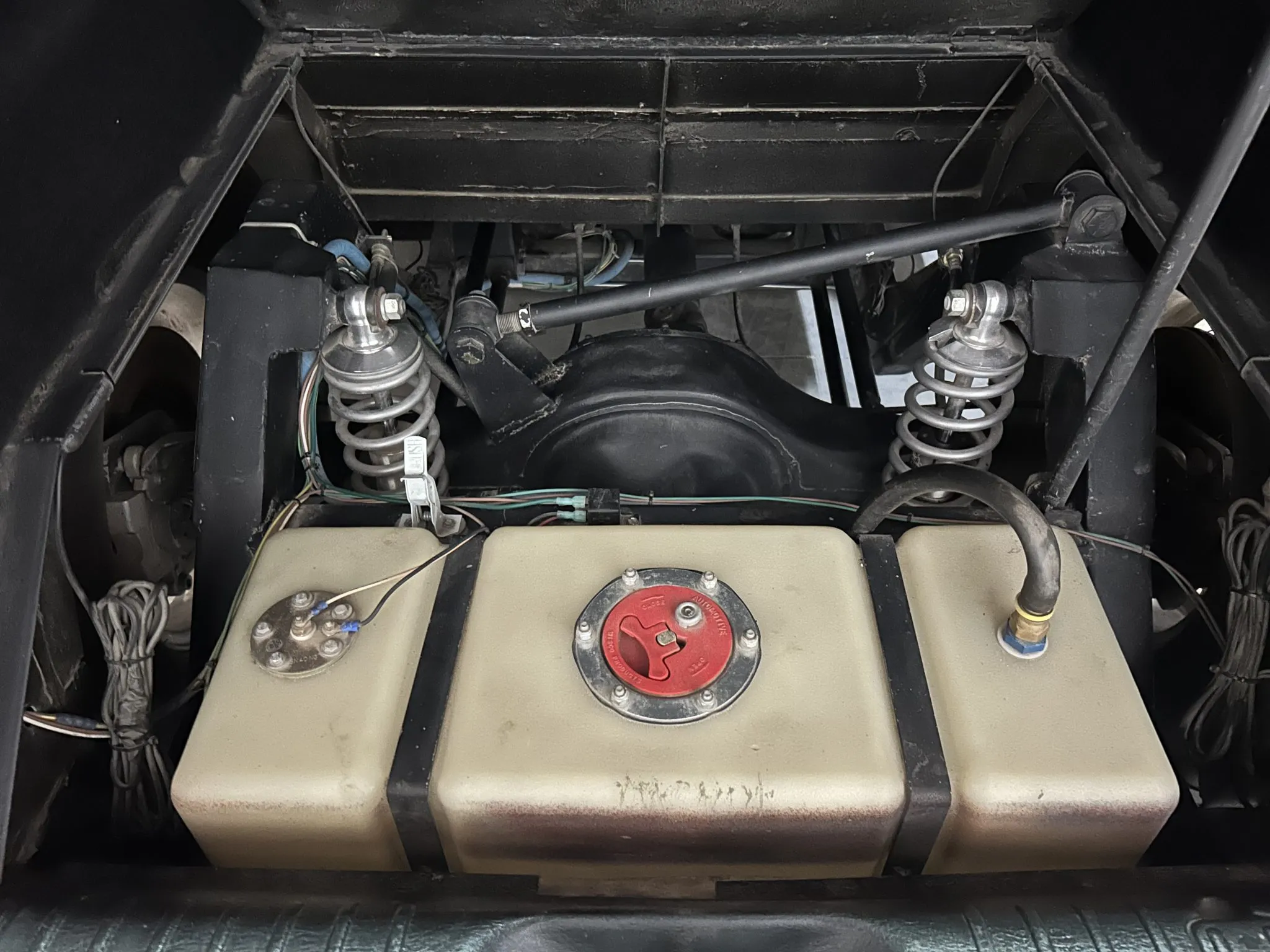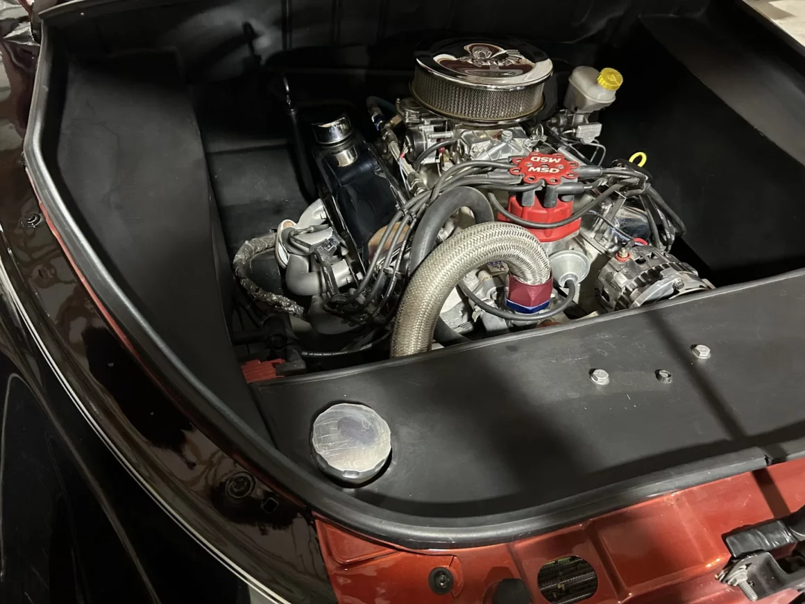 Il dispose d’un collecteur d’admission en aluminium Edelbrock, d’un carburateur QFT, d’un arbre à cames haute performance, de culasses en aluminium et d’un système d’entraînement serpentin en billette, ainsi que de composants d’allumage MSD, d’un démarreur à couple élevé d’une direction assistée. Un radiateur Flex-A-Lite à quatre conducteurs avec un ventilateur électrique réglable assure le refroidissement. Voilà…