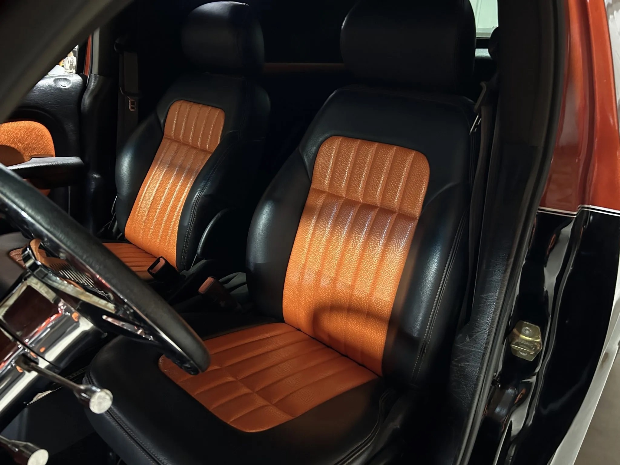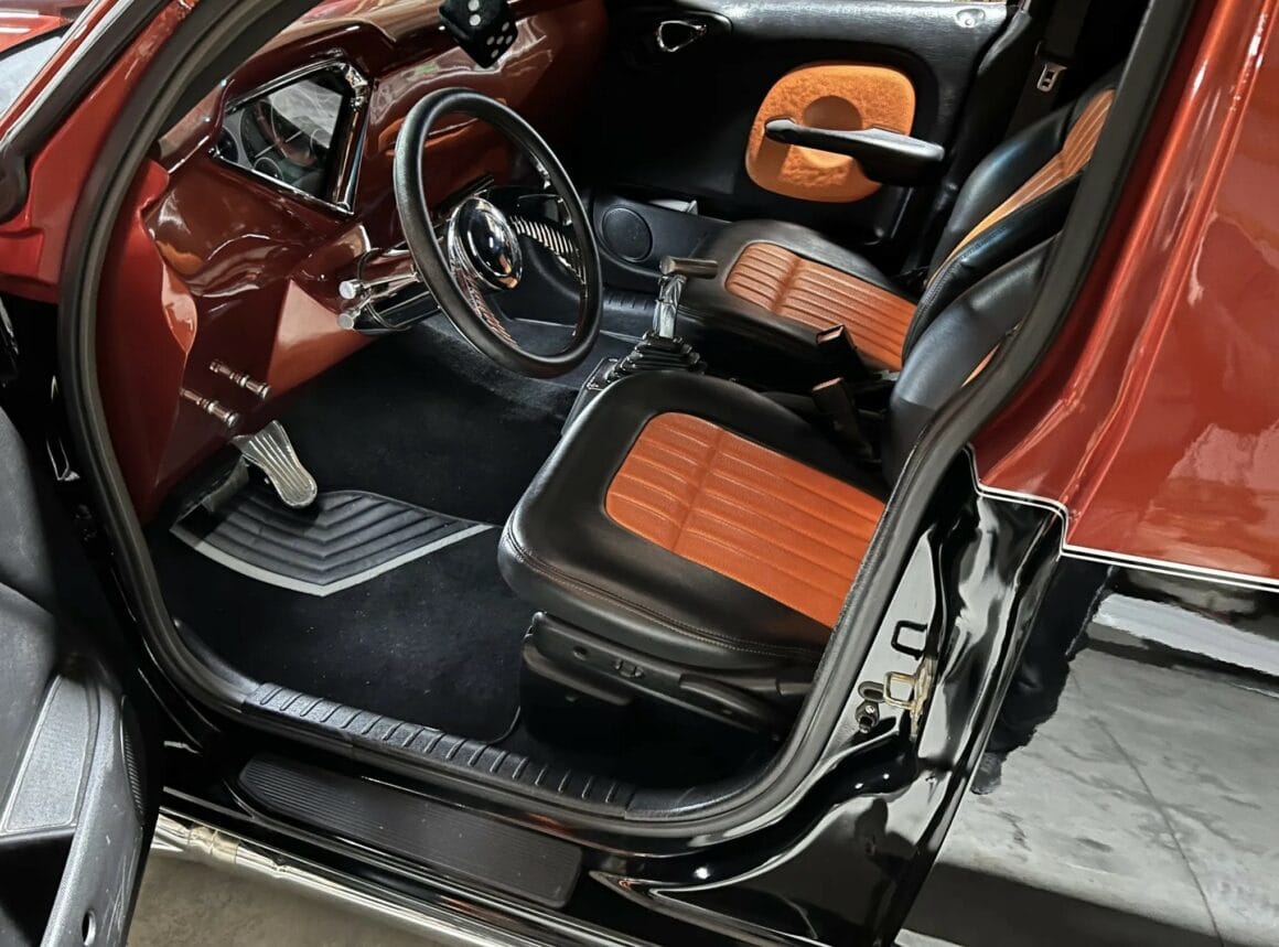 Un kit d’éclairage LED bleuté a été installé sous la carrosserie pour créer en effet “soucoupe volante”… Les sièges baquets sont garnis de vinyle noir avec des inserts orange, et une palette de couleurs assorties s’étend aux portes et aux panneaux arrière. Une poignée de frein d’urgence Lokar et un Mega Shifter B&M sont installés, ainsi qu’une unité principale double reliée à un amplificateur, un condensateur, des haut-parleurs et des subwoofers.