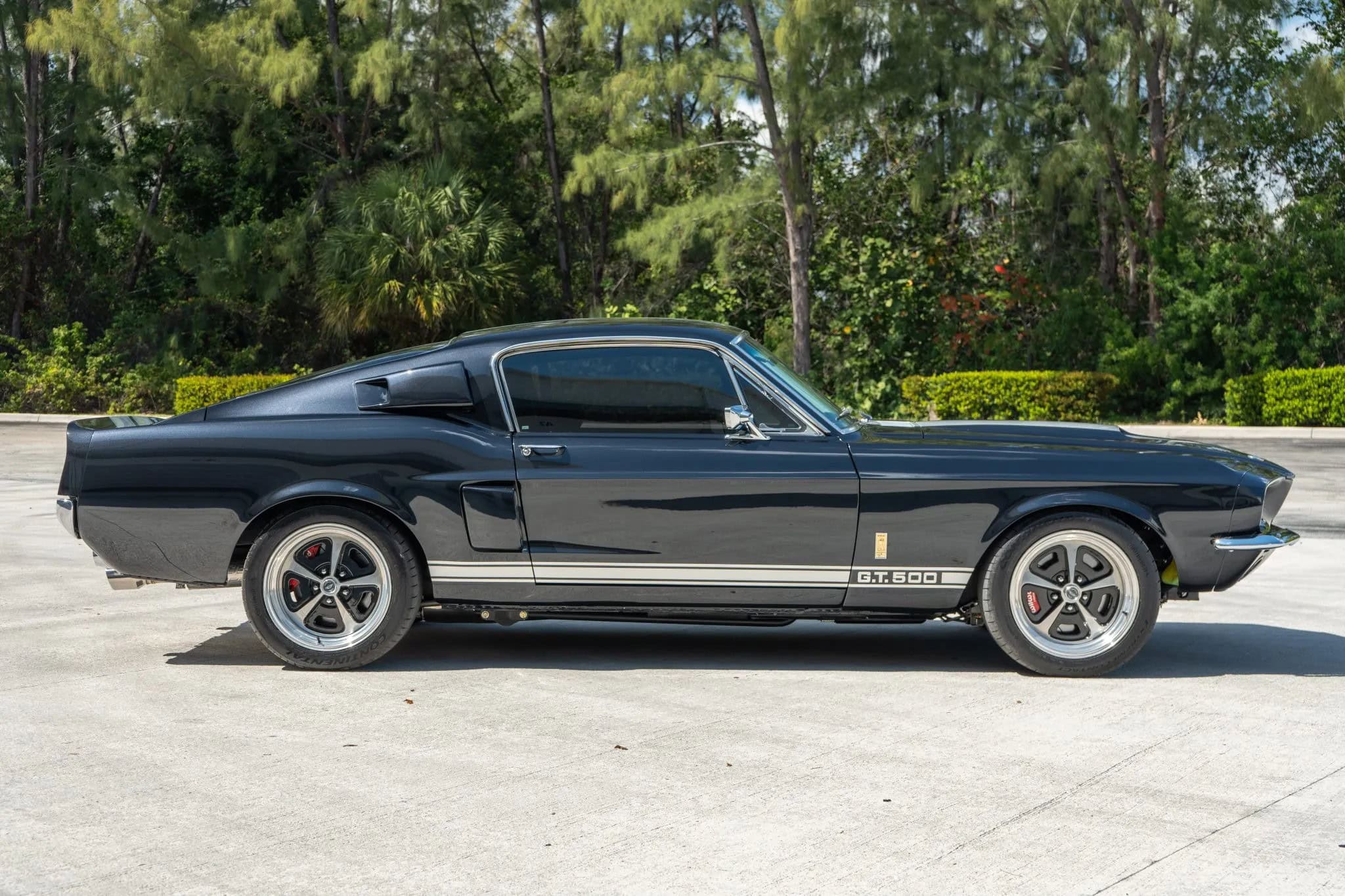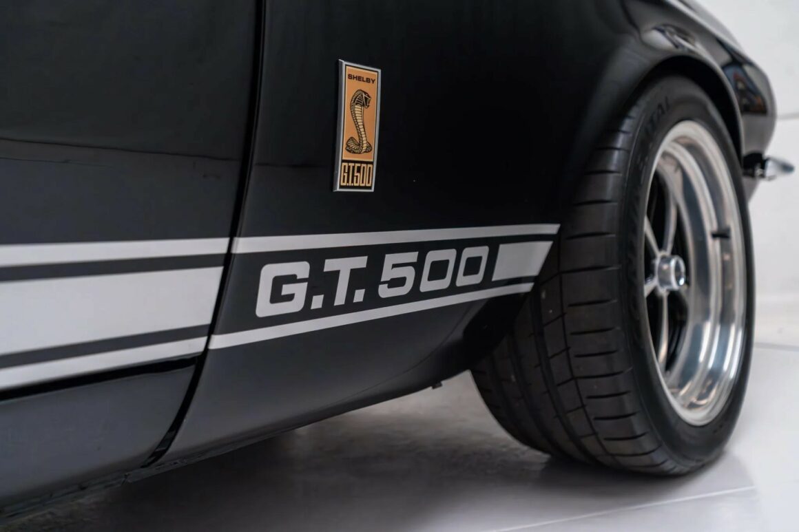 Sans doute pour plusieurs générations… Ca commence maintenant, il manque 50 milliards au budget Français… Bref… Amusons-nous encore… Pour cette Shelby Réplica “officielle”, le châssis monocoque en acier est soudé à l’interne et dispose d’un renfort en X intégré et de points de montage pour les sous-châssis des suspensions. Cet exemple de Shelby GT500 a été peint en noir de jais métallisé avec des bandes/course Shelby en Silver Frost Metallic…