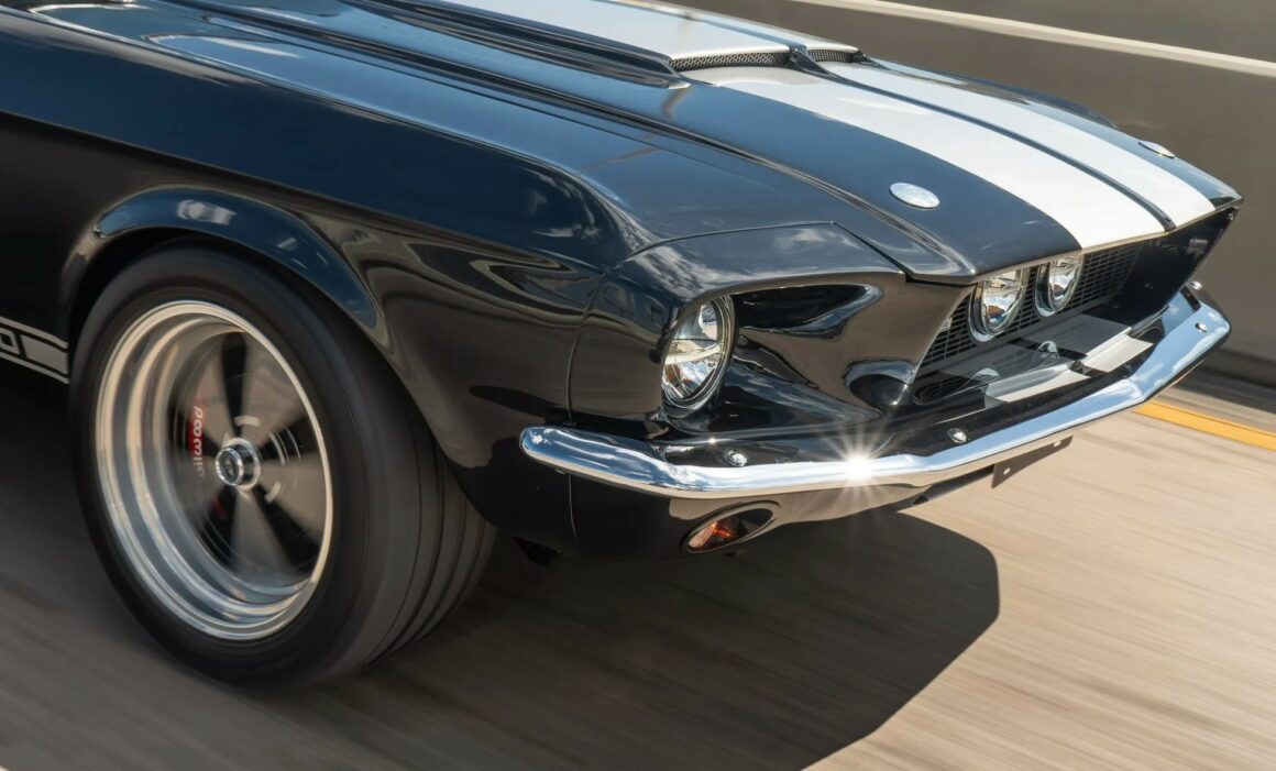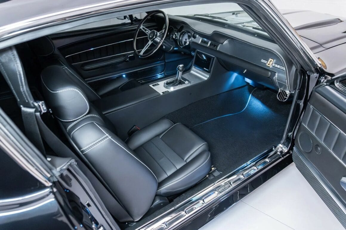 Ce garage est situé à Orlando, en Floride et cette Mustang a été réalisée et achevée en 2021, peinte en noir-jais métallisé avec des bandes Silver Frost métallisées et propulsée par un V8 Ford Coyote 5 litres suralimenté, un savoir-faire de Roush Performance… Ce moteur a été associé à une transmission automatique dix vitesses (commande électrique) et l’arbre de transmission en fibre de carbone est associé à un pont-différentiel à glissement limité 8,8 po.