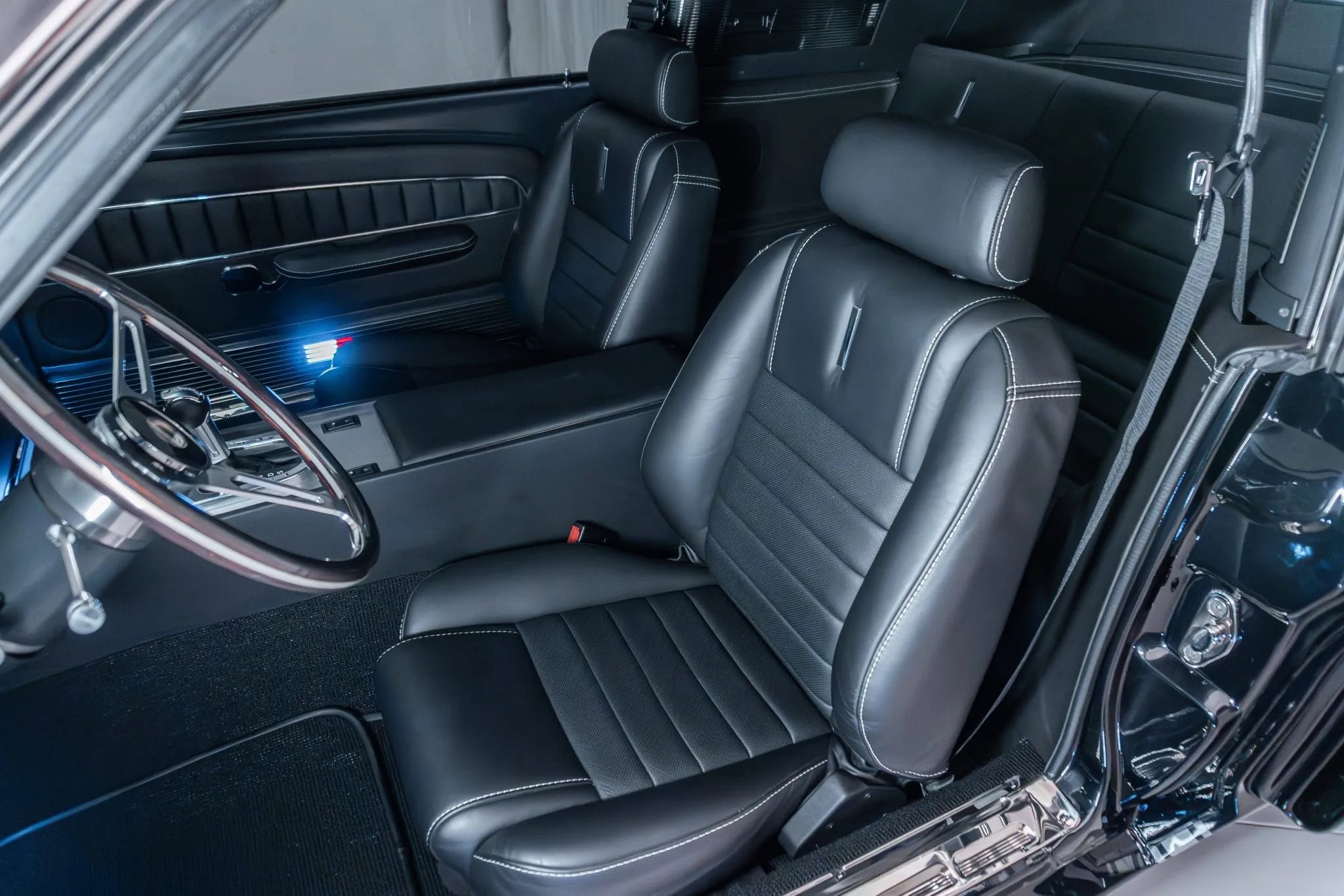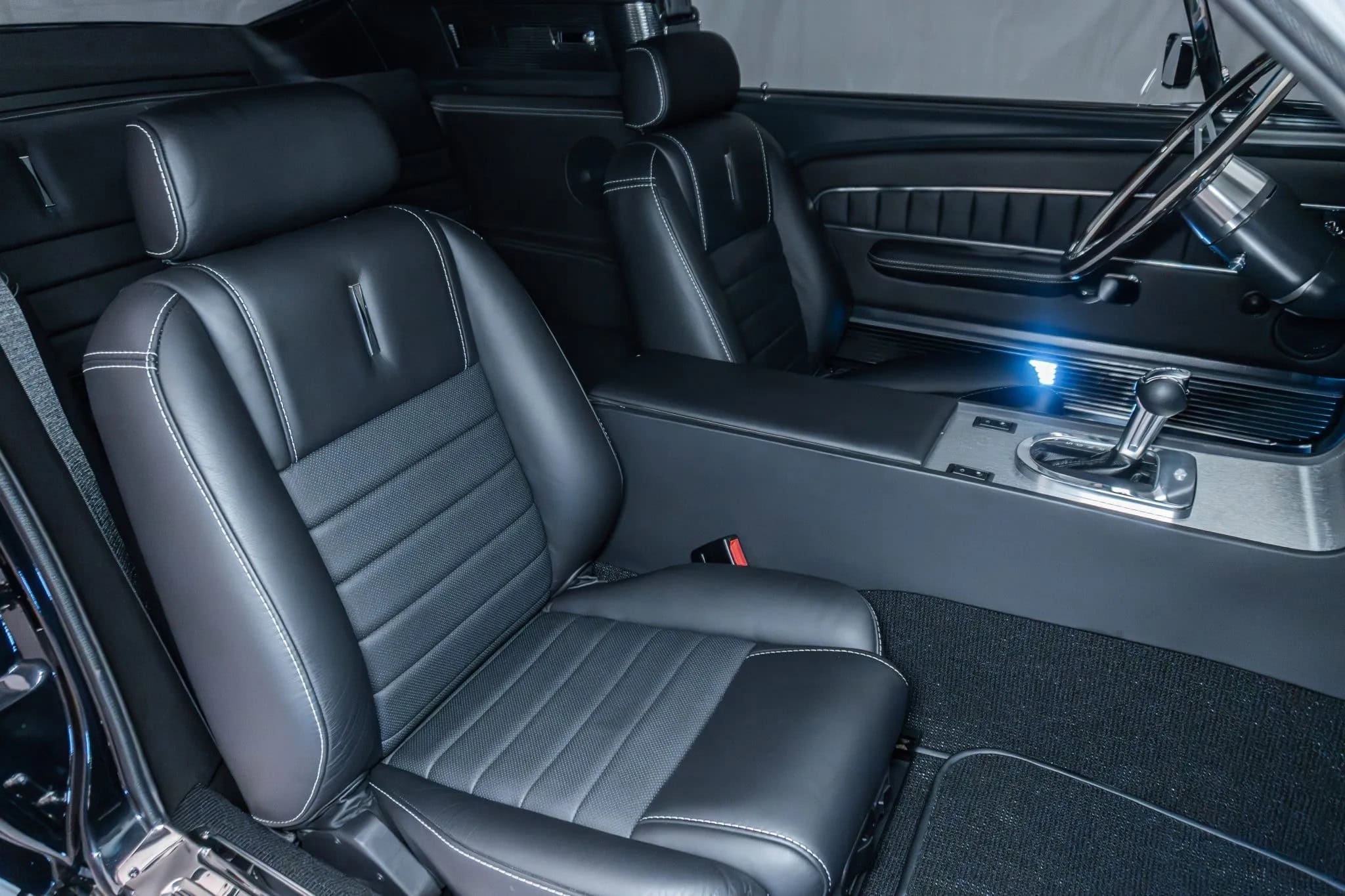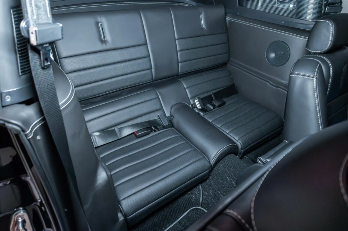 La suspension avant indépendante est dotée d’un sous-châssis en aluminium et de bras de suspension tubulaires “Detroit Speed” de longueurs inégales, tandis que la suspension arrière à trois bras comporte un quatrième bras de couple ainsi qu’une tige Panhard. Le freinage est assuré par des disques Wilwood assistés aux quatre roues avec étriers rouges… Les sièges avant rembourrés et les sièges arrière rabattables sont garnis de cuir Nappa noir.