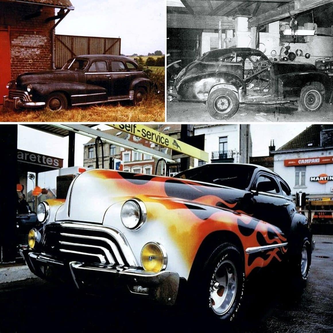 Elle était en cours de reconstruction au garage Anfo-Motors de Bruxelles (qui avait déjà reconstruit la Taunus), lorsque tous les accessoires ont été volés (y compris les jantes)… et peu après le garage Anfo-Motors a fait faillite et l’Olds’48 a disparue temporairement, puis est réapparue dans une casse automobile dans un état de délabrement épouvantable… Pas moyen de la remettre en état correct…