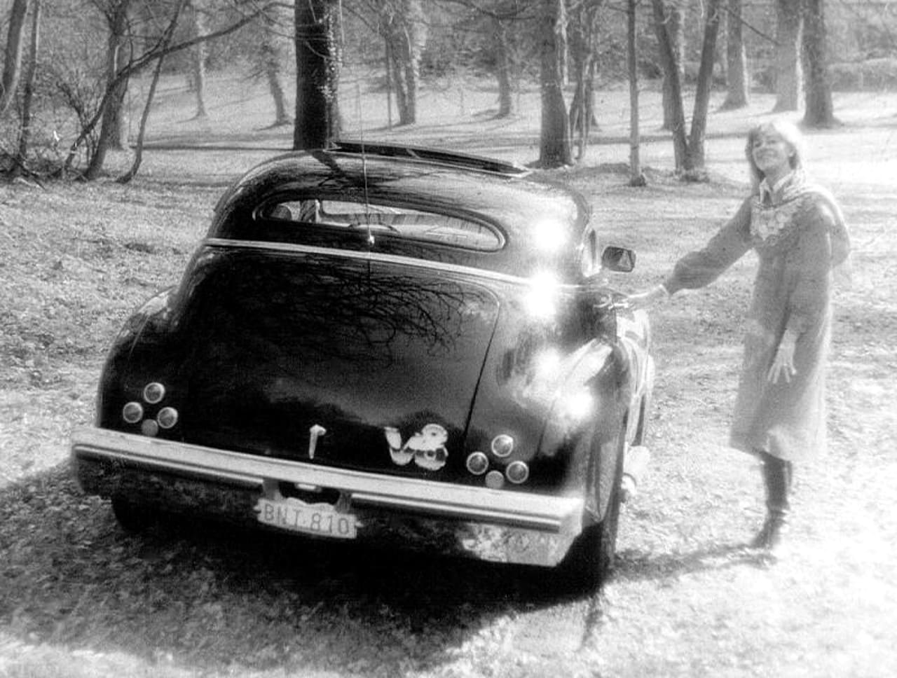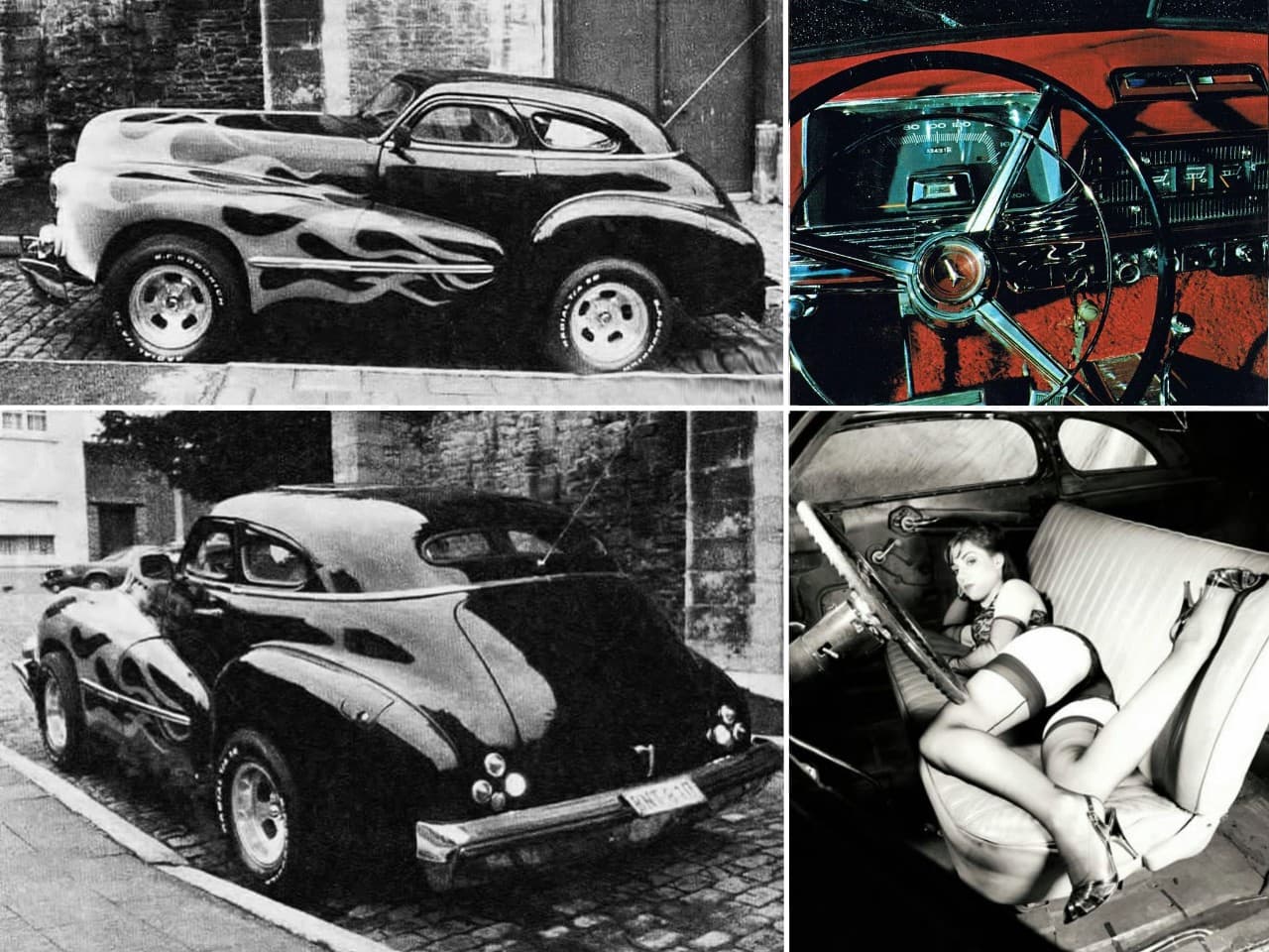 Durant ce temps, l’Odsmobile 1948 Sedan 4 portes, devenait un coupé 2 portes avec un toit surbaissé de la moitié de sa hauteur, ce qui, sans calcul particulier, amena la pente arrière du toit à former un ensemble homogène avec la ligne de coffre intouchée. L’intérieur suivit le même chemin, avec un tableau de bord quasi intouché (sauf l’adaptation des compteurs de la plymouth Fury III)… et le siège banquette arrière de cette même Fury aménagé en siège/banquette avant. 4 jantes “ET” destinées à une Mustang, furent montées avec des pneus BfGoodrich… et, pour suivre la tendance de l’époque deux “side pipes” (échappements latéraux) furent fixés en bas de caisse, ce qui coûtait d’ailleurs moins cher qu’une ligne d’échappement traditionnelle.