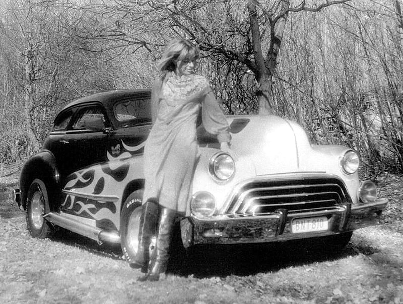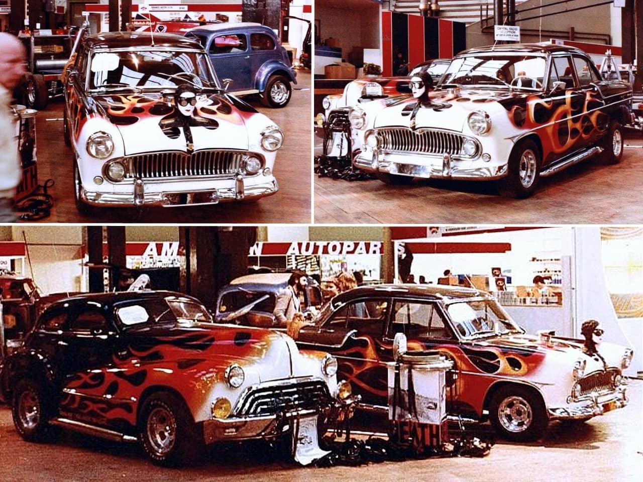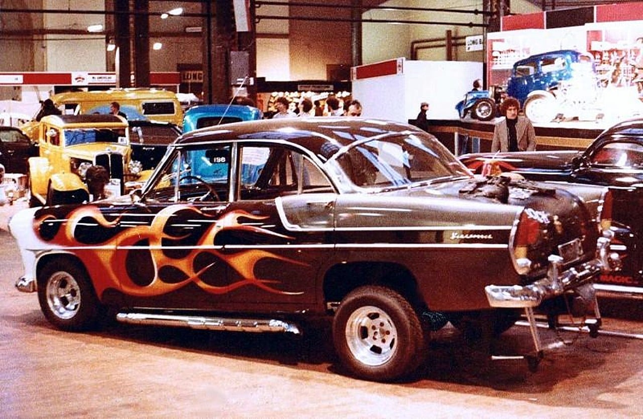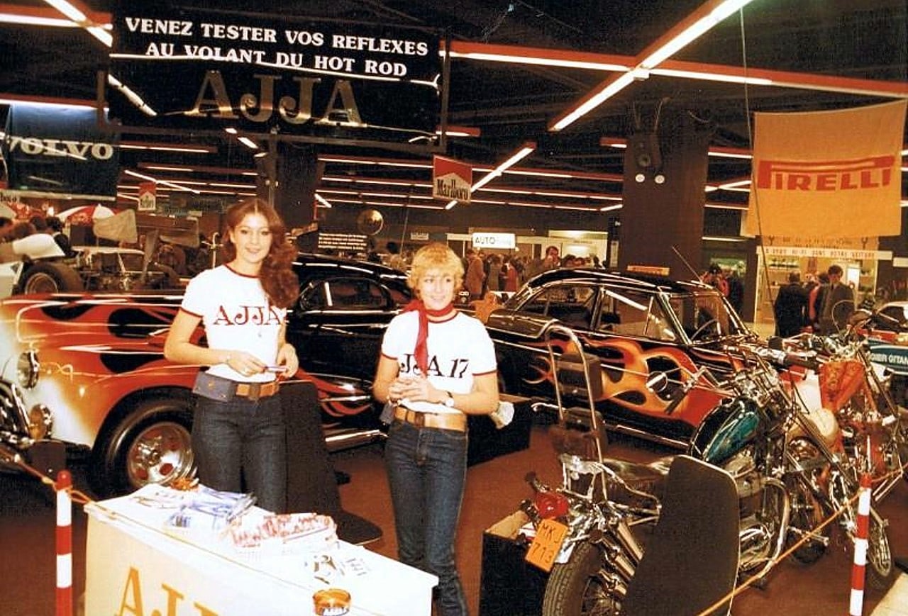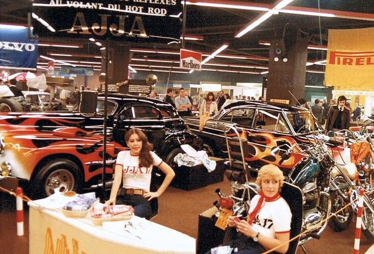 Mais bon…, comme l’argent rentre à flots, je ne vais tout de même pas fermer les vannes (double sens)… C’est dommage, car les flammes étaient bien plus dans l’esprit “Rod” que les peintures “Viking” customizées… L’Olds’48 et la Taunus, escortées par l’ineffable Simca Versailles “Hot-Rock” et par des Choppers, sont ensuite exposées dans divers salons, dans les halls de gare… et partout ou il est possible de capter l’attention du public. Des bataillons de filles noires et de filles blondes (presques nues) distribuent des prospectus (des leafleet) contant l’aventure du Hot-Rodding… avec des cigarettes.