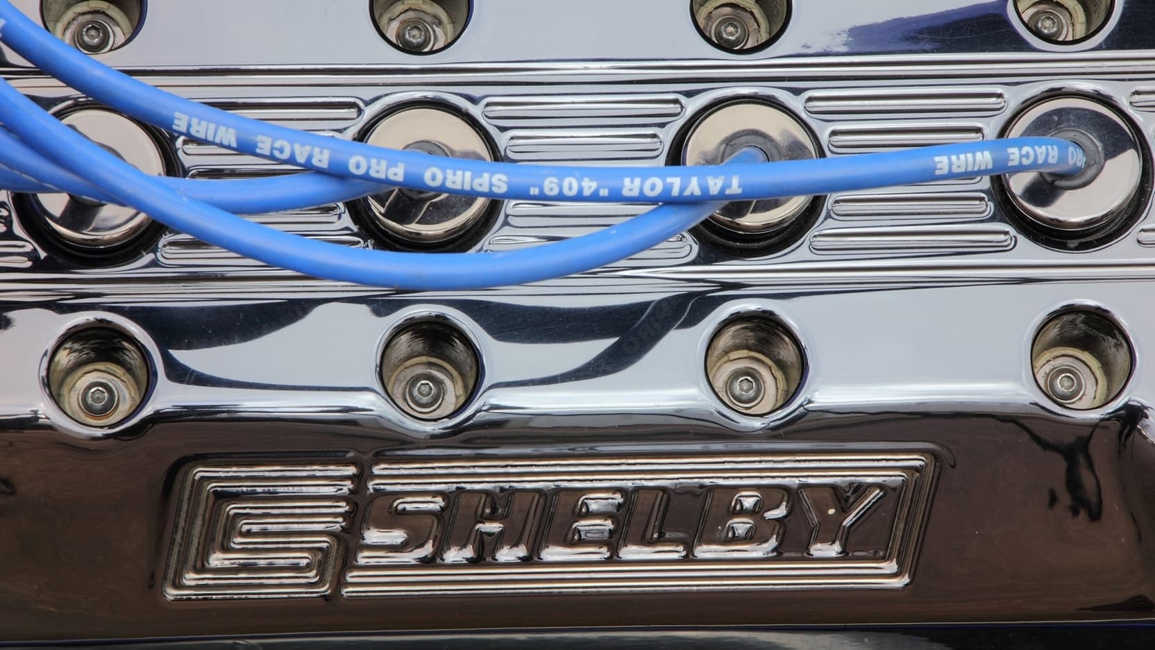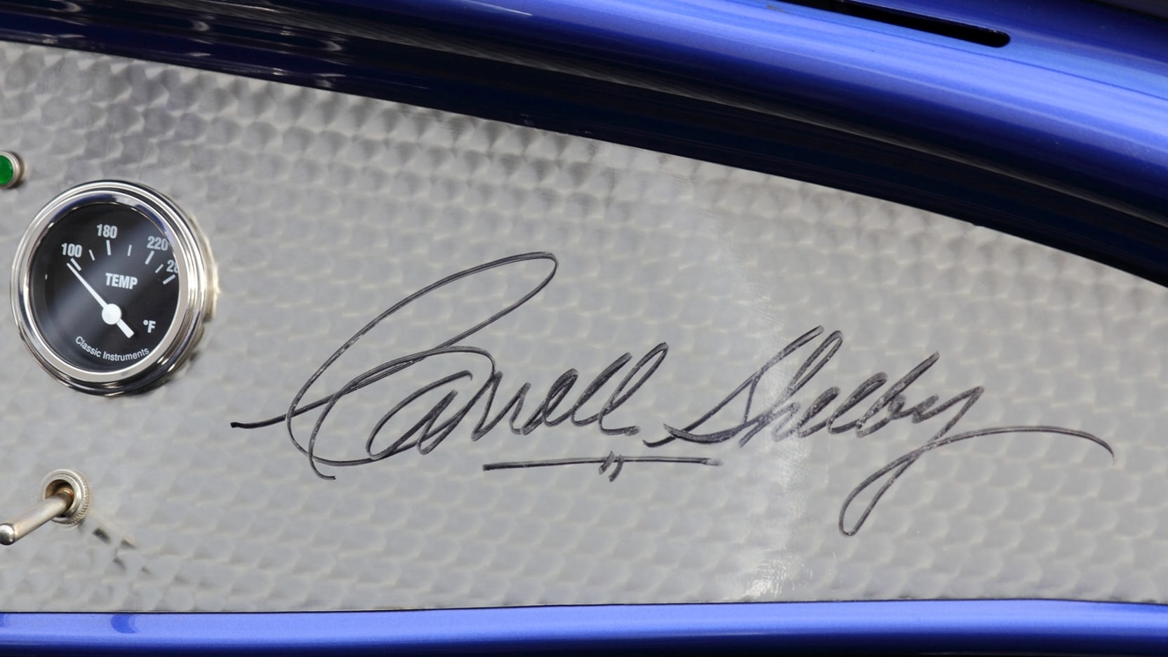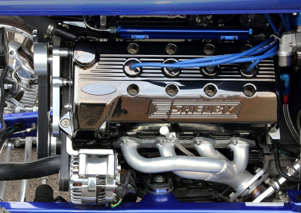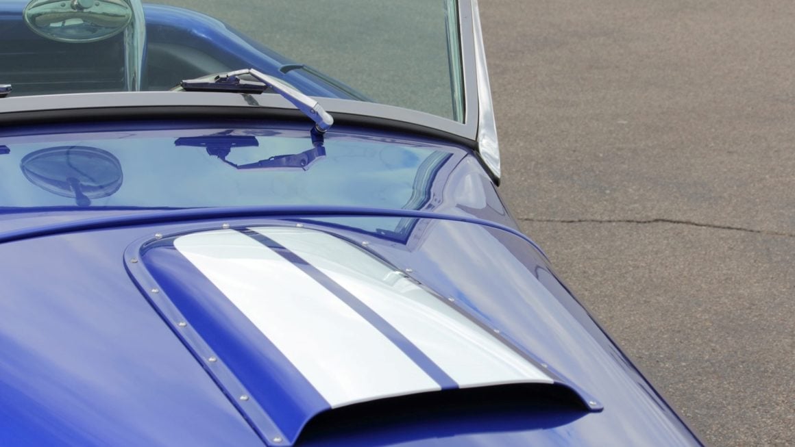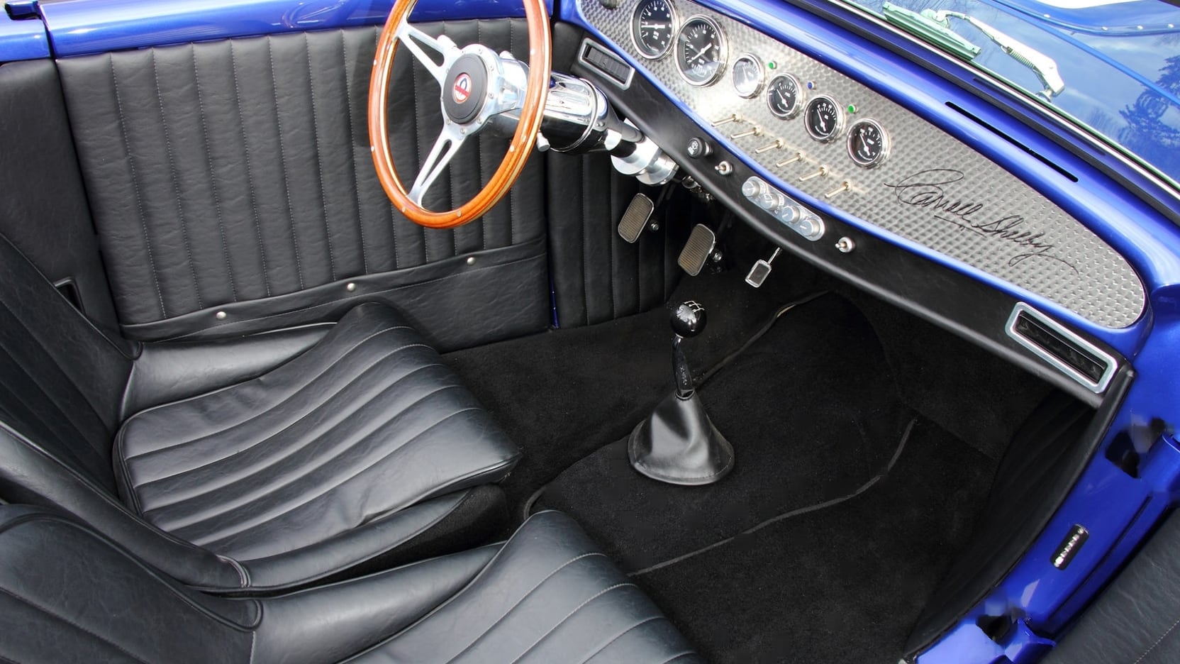 Tout y était : Suspension arrière indépendante avec freins à disque intégrés et tous les éléments stylistiques associés aux célèbres roadsters Shelby Cobra : Arceau de sécurité, bouchon externe de remplissage rapide, bouches d’aération, refroidisseurs d’huile, écopes de capot et jantes en alliage Halibrand.