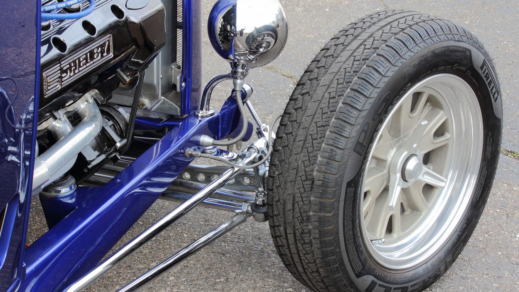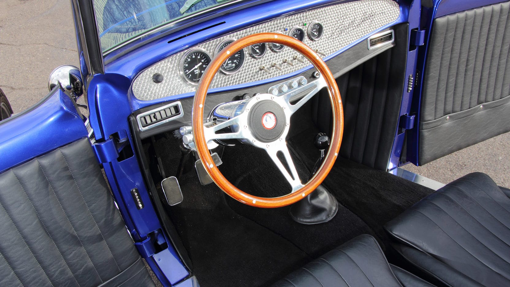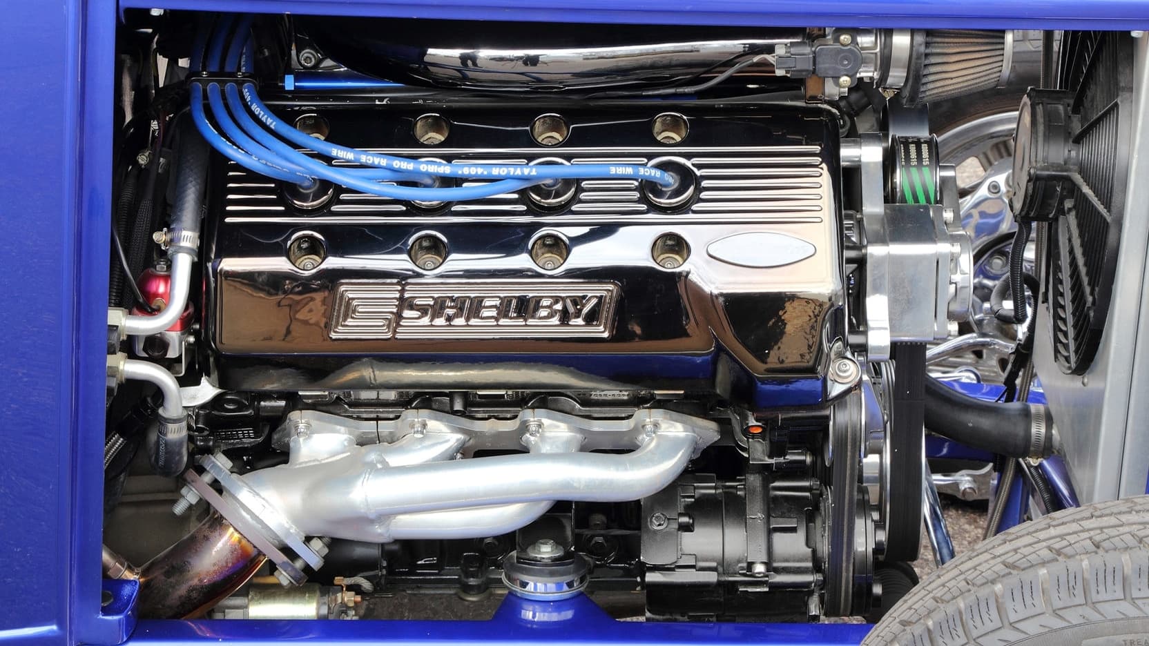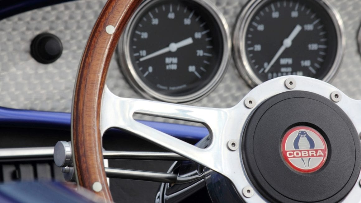 Tout y était : Suspension arrière indépendante avec freins à disque intégrés et tous les éléments stylistiques associés aux célèbres roadsters Shelby Cobra : Arceau de sécurité, bouchon externe de remplissage rapide, bouches d’aération, refroidisseurs d’huile, écopes de capot et jantes en alliage Halibrand.