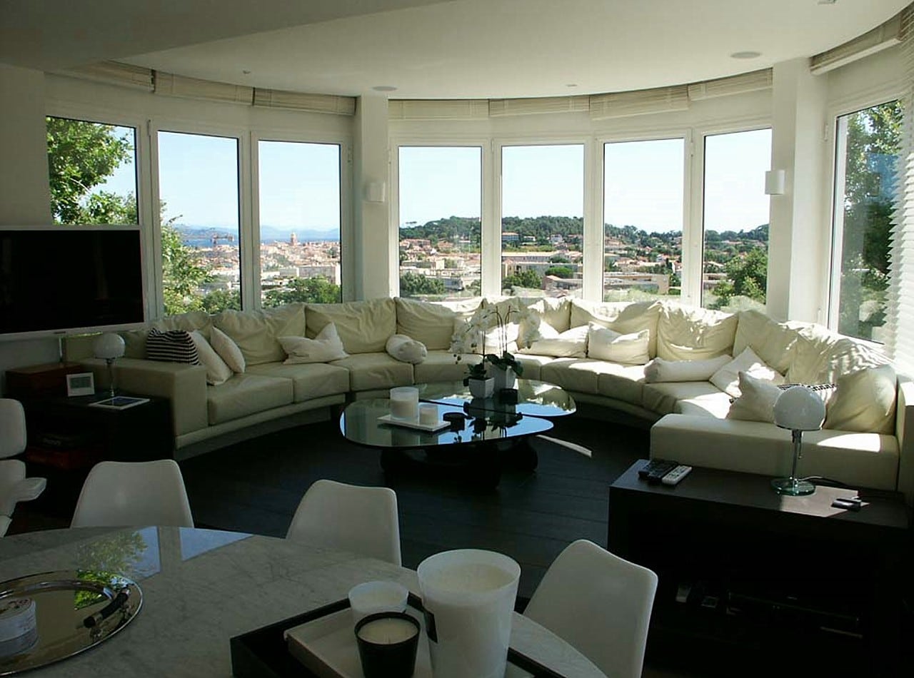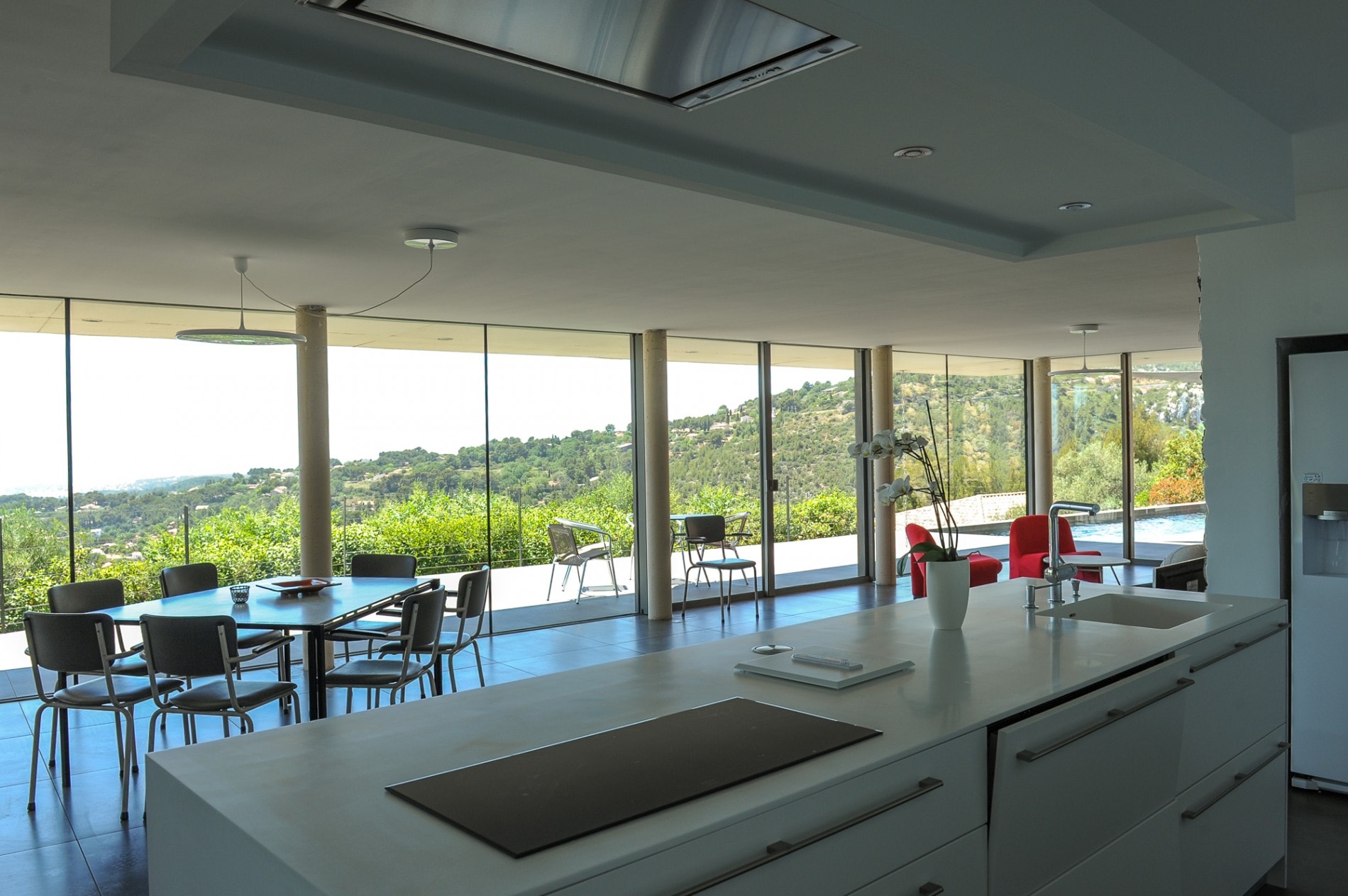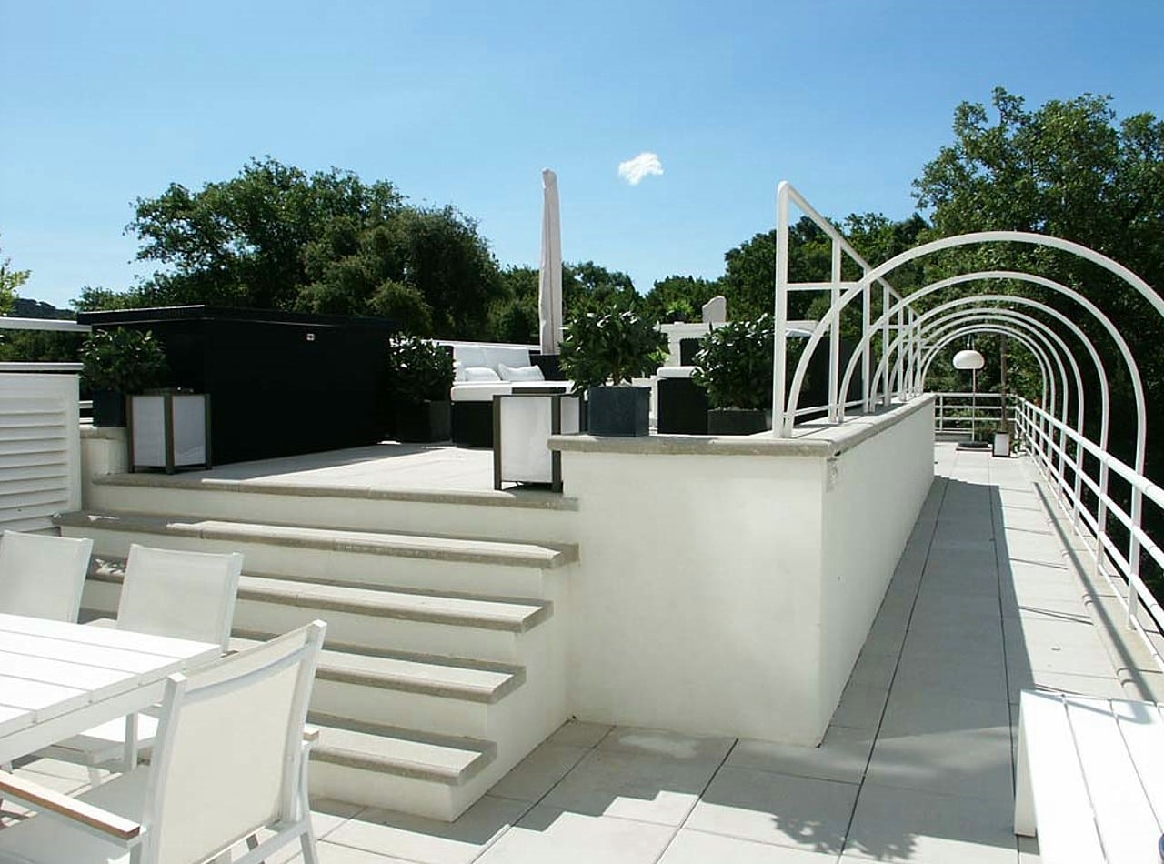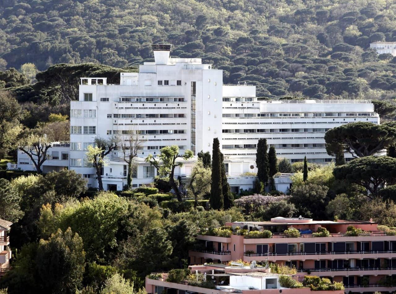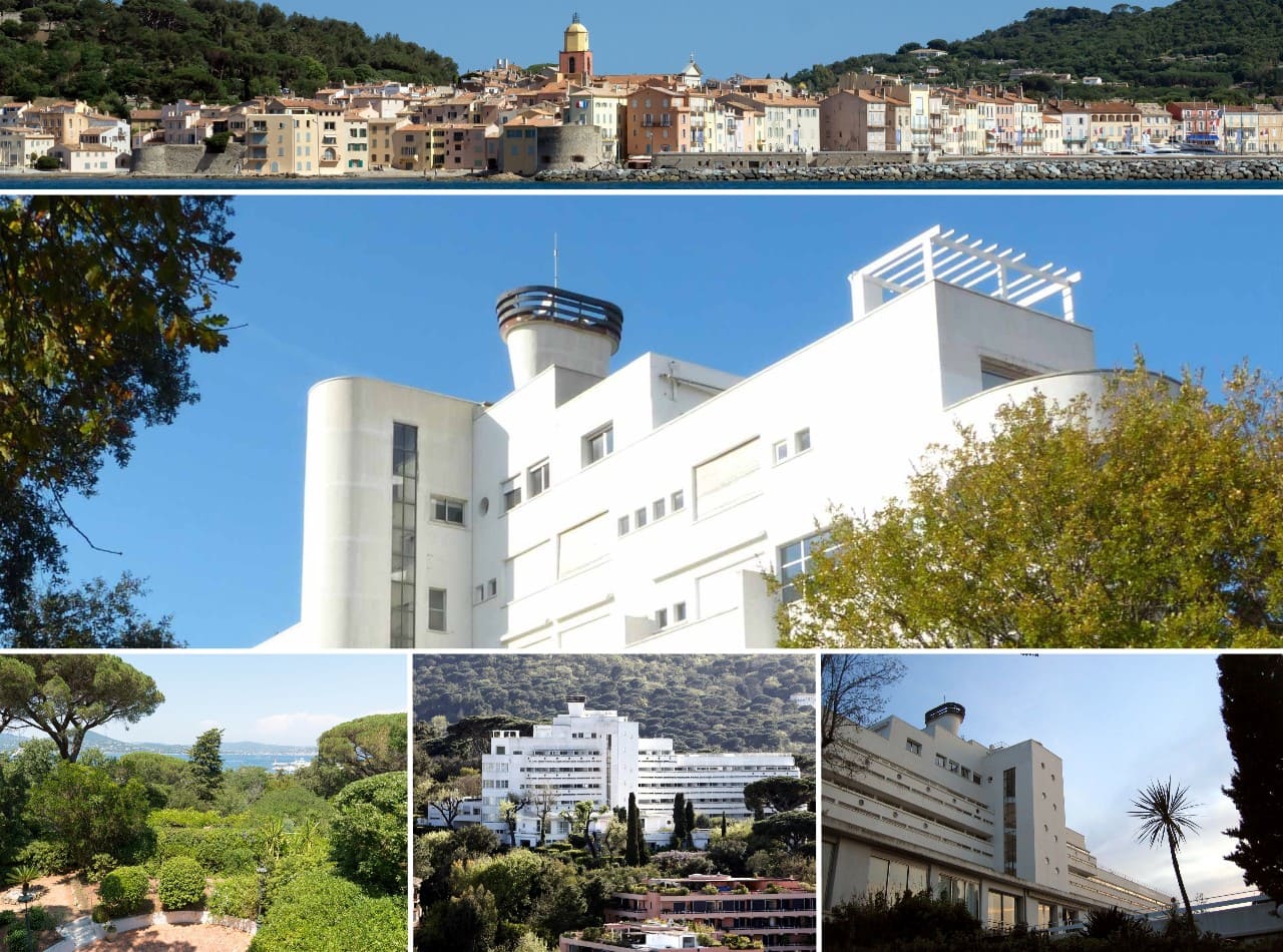 Un drôle d’édifice que ce Latitude 43…, depuis la mer, ou depuis Sainte-Maxime, ce vaisseau immaculé semble flotter sur une mer végétale…, tous les regards sont naturellement happés par cette masse blanche qui se détache au-dessus du village corsaire, certains croient même qu’il s’agit de l’hôpital de St-Tropez…