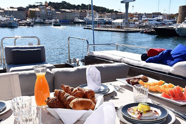 -“Formule à quai ou en croisière avec mouillage dans l’une des plus belles baies de la Côte d’Azur, vous profiterez d’un magnifique coucher de soleil sur la Méditerranée. Les lumières de la Côte d’Azur et la vue féerique vous feront passer un moment inoubliable alliant prestige et raffinement”.