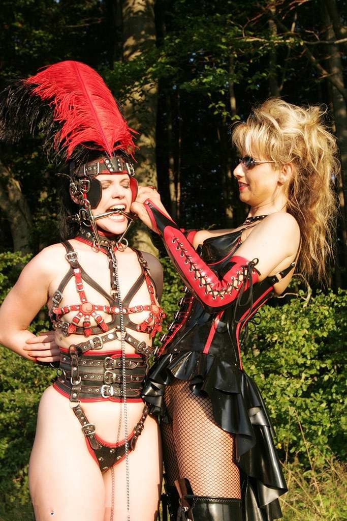 Ensuite elle a détaché mes bras mais les a rattachés derrière moi en verrouillant chacun de mes poignets dans les anneaux . Puis elle m’a aidée à me relever. Il commençait à faire froid et la nuit tombait, j’avais commencée à entendre les animaux de la nuit lançant leurs appels dans le bois. Jennifer m’a alors rattachée de la même façon, verrouillant mes membres avec les mêmes cadenas, j’étais sa Pony-girl… “Hue cocotte, direction le bois et la BMW, dépèche- toi, la nuit tombe et il va faire froid “... Je me suis mise à trotter, Jennifer me suivait en tenant fermement la longue laisse. Je montais mes genoux bien haut, mes seins bougeaient en tous sens. A chaque ballotement je sentais la morsure des pinces s’incruster plus profondément dans mes tétons. Le bâillon-boule et le harnais en place me faisaient abondamment saliver, je sentais que ça coulait le long de mon menton… Je sentais aussi que je mouillais abondamment, le gode faisait son effet, le plug aussi, et lui c’était l’extase. Je sentais au fond de moi le bout du gode et le bout du plug qui se touchaient entre mes peaux, tous les 2 pas, le bout du gode heurtait mon utérus, et à chaque fois c’était un flash d’orgasme, une chaleur m’envahissait, je sentais la cyprine couler…