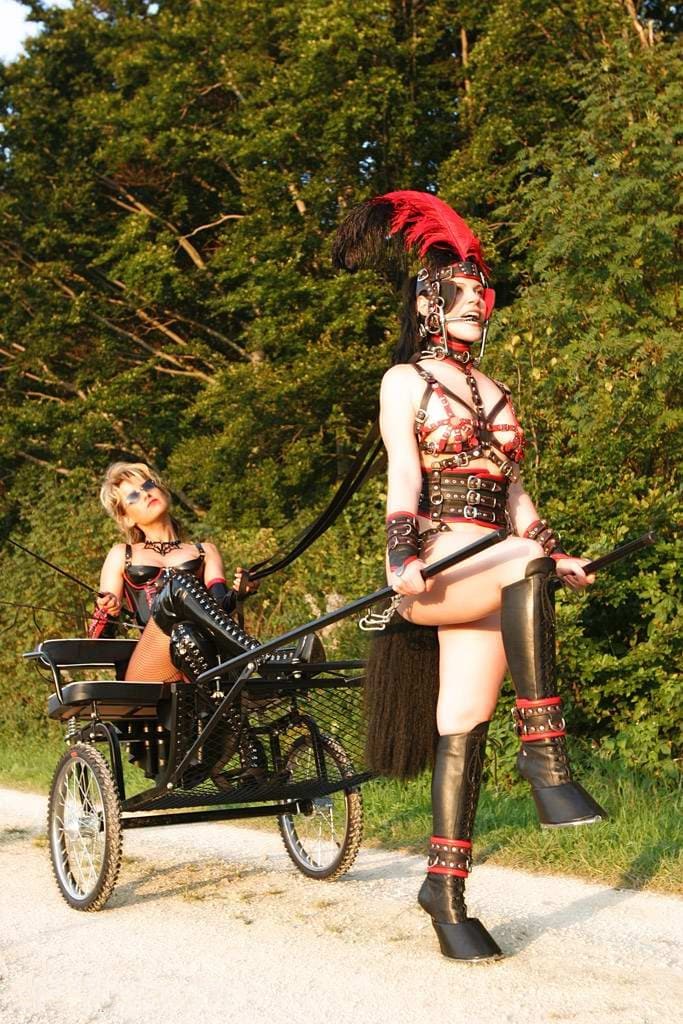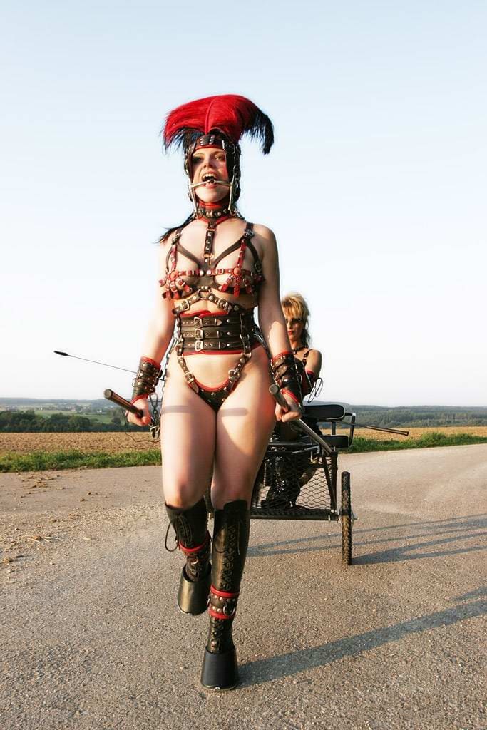 Tout ce qu’il me restait à faire maintenant était de mettre le gode vibrant en marche et de placer un cadenas dans leurs crochets pour réunir et verrouiller ensemble les anneaux de poignets. Des sensations délicieuses m’ont alors envahie. Les vibrations du gode et la sensation de toutes les lanières qui étaient fixées avec des cadenas, m’ôtant toute possibilité de me détacher, m’ont fait immédiatement jouir… J’ai alors placé mes mains derrière mon dos et j’ai fermé les cadenas des deux anneaux. Maintenant complètement impuissante, je ne pouvais rien faire d’autre que de rester là, attachée, et me réjouir de mon harnachement de Pony-girl. C’est alors qu’un coup de fouet claqua contre mes fesses… Jennifer, qu’elle gâââârce !!! Elle s’était rhabillée d’une petite jupette en cuir noir et de chaussures lacées à talons hauts et m’astiquait avec un petit fouet… “Hue cocotte” me dit-elle en souriant avec perversité….”Tu vas trotter autour de la machine en levant les genoux, je veux voir tes seins bouger et te voir jouir des sensations du gode et du plug qui vont s’entrechoquer en vibrant dans tes fondements”...