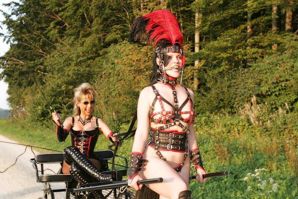 “Et maintenant, je vais être ta Pony girl !” dis-je à Jennifer… “Je vais m’harnacher ici et le jeu consistera à visiter l’usine puis à aller jusqu’à la BMW en plein milieu des champs, en parallèle du chemin boueux jusqu’au début de la forêt ou se trouve la BMW”... Je me suis plaçée solidement le bâillon-boule dans ma bouche, il faisait partie intégrante d’un nouveau harnais de tête que j’avais achetée récemment. Le propriétaire du magasin m’avait fait une démonstration en me le passant, et cela m’avait envoyé des fourmillements sur la peau lorsqu’il m’avait touchée. Quand il eut fixé les lanières, je fondis lorsqu’il le sécurisa sur ma tête, “S’il vous plaît faites de moi votre esclave”… pensais-je alors que mon corps devenait chaud, me tenant debout là dans le magasin avec le bâillon-boule dans la bouche. Faisant pénétrer la grosse boule dans ma bouche, j’ai commencé à fixer les lanières en place derrière ma tête avec les lanières de harnais courant tout autour de celle-ci et sous mon menton, cela était parfaitement serré et verrouillé en place avec un petit cadenas sur l’arrière. J’ai ensuite enfilée mes longues cuissardes avec les talons de 14 cms…