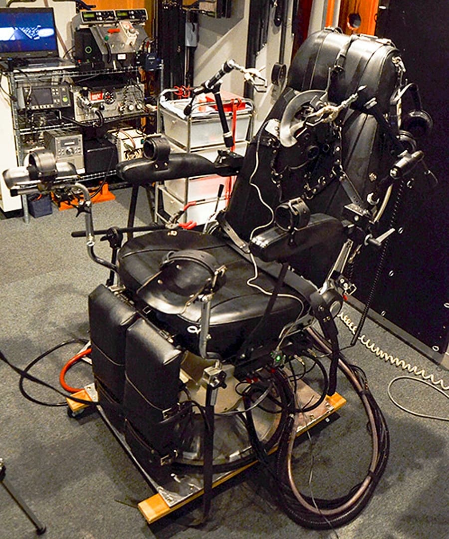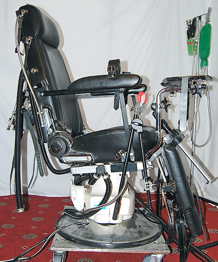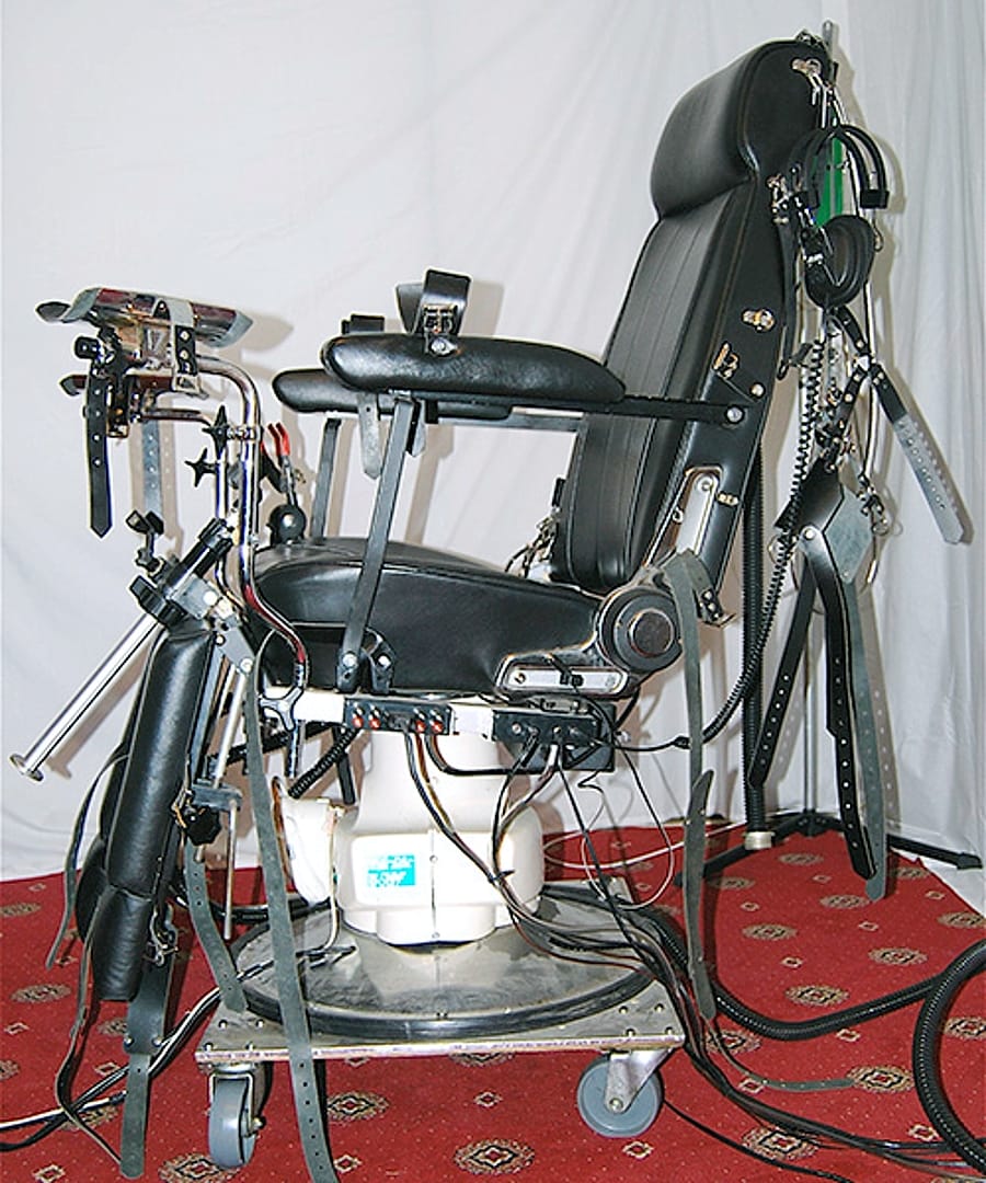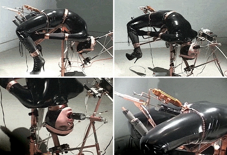 Durant deux minutes toutes les entraves se tendent assez vite, mais seulement pour assurer la tension préalable…, elles ne font que soulever mes membres sans les étirer et, si je résiste, le mouvement s’interrompt…, cela me permet de mieux m’accoutumer à ma position…, ensuite le programme prend tout en charge…, le fauteil bascule en arrière, mes jambes se soulèvent, s’écartent vers l’avant.