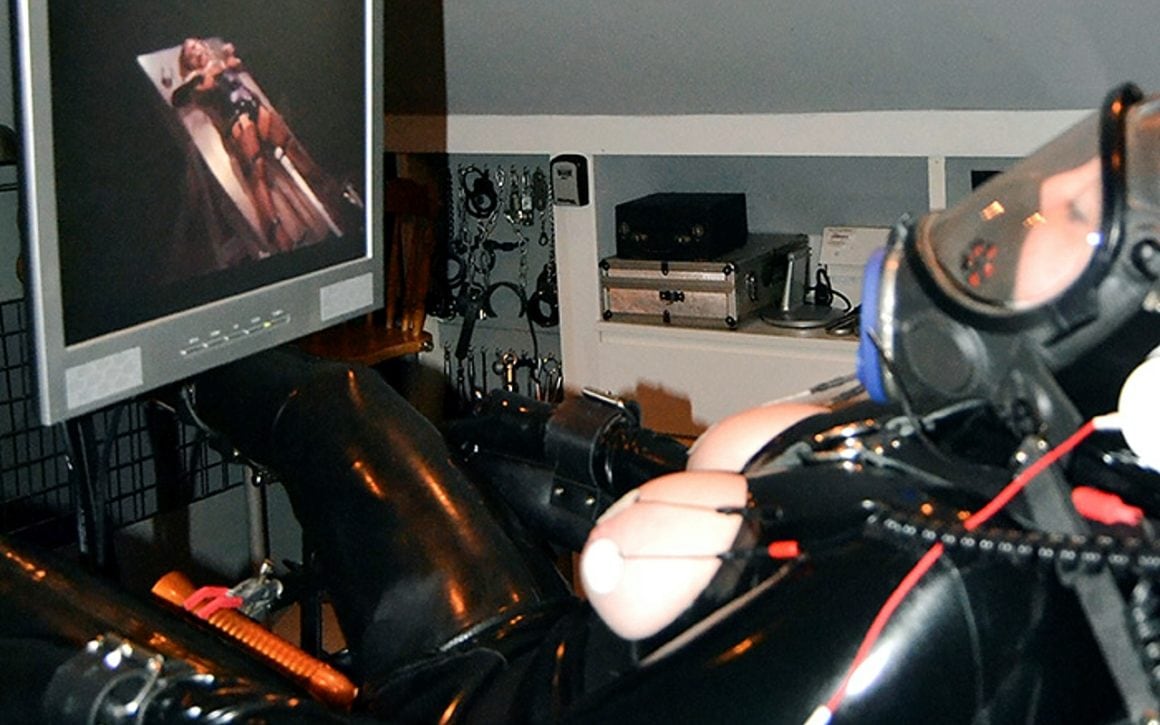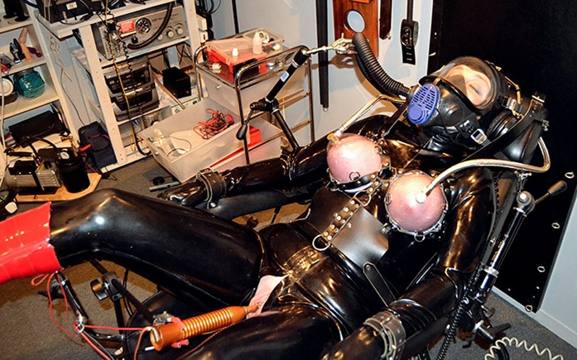 Ensuite j’enfile le bustier-corset en latex muni de baleines qui me cambre de partout, me donnant une taille de guèpe, il me recouvre toute la hauteur de mon ventre, emprisonne mes seins, et recouvre mes clavicules jusqu’au dessous du menton…, la sangle de serrage se trouve derrière mon cou…, à l’avant dernier trou je ne peux plus faire le moindre mouvement de la tête ; je n’utilise qu’exceptionnellement le dernier pour l’exercice et jamais lorsque j’ai les mains immobilisées à cause des risques de suffocation.