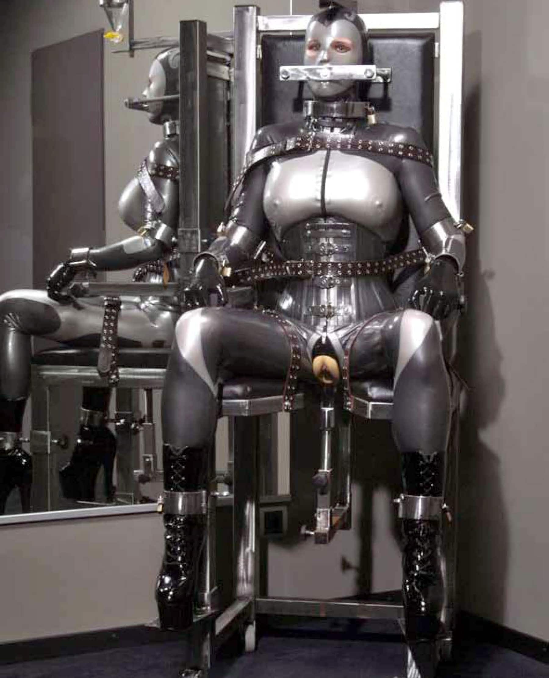Aujourd’hui, je laisse les deux derniers trous et glisse l’ardillon dans le troisième…, je suis ainsi contrainte de conserver une posture rigoureuse mais, s’il le fallait, je serais capable de tourner la tête, au prix d’un extrême inconfort…, je fixe ensuite le bâillon ouvert, un tuyau de caoutchouc de 10 cms qui passe dans ma bouche, m’empêche de fermer ma mâchoire…, il se subdivise sur l’avant en deux tuyaux plus petit qui sont reliés à une minuscule bouteille contenant un gaz destiné à décupler mes fonctions sexuelles…, deux tiges nickelées, dont l’écartement se règle à l’aide de vis papillon, me font un mors étrange qui me pince la langue et la tirera avec une rigueur prédéterminée…