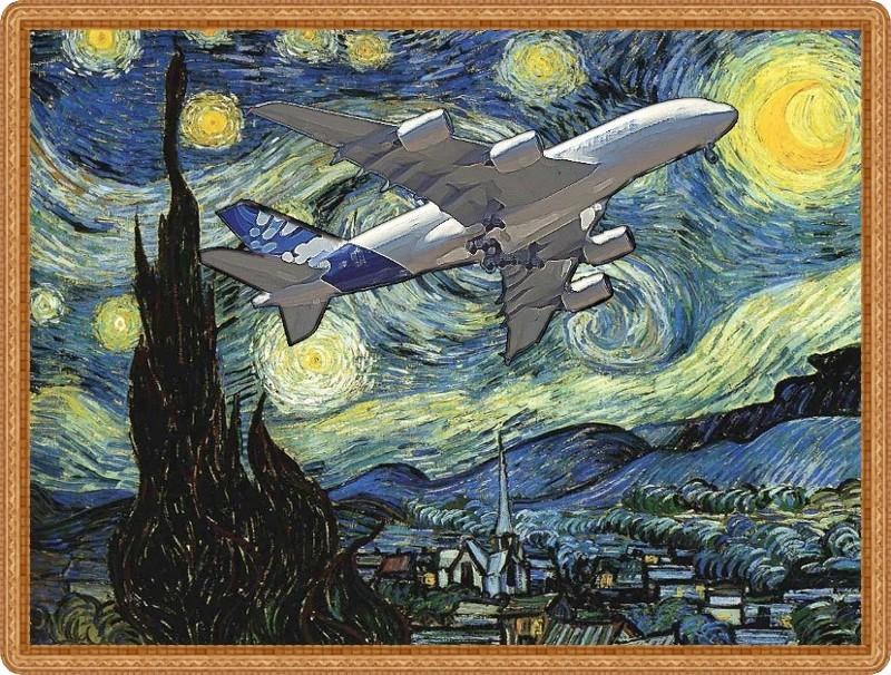 Il sourit en regardant un tableau Van Gogh au mur, intitulé “Les Tournesols et le Boeing“…