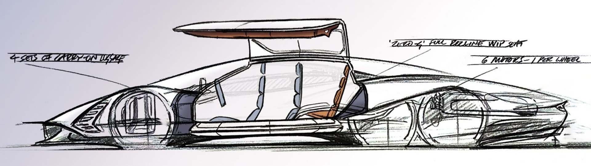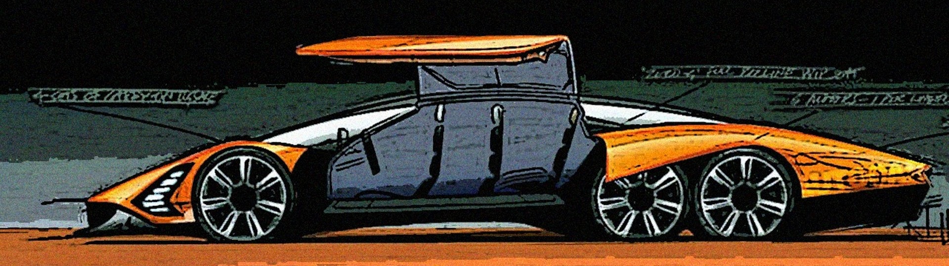 Comme je dirige GatsbyOnline et que l’automobile y dispose d’une place importante, ce que je viens d’expliciter est volontaire pour introduire une Nième arnaque destinée à profiter des ceusses qui savent et peuvent encore créer des fortunes. Pour eux (pas pour vous qui devenez de plus en plus fauchés et allez vraisemblablement crever dans d’atroces souffrances après lente décomposition de vos finances et de vos fausses bontés d’âme (êtes-vous abonnés à GatsbyOnline, bande de rats ?) Hennessey dévoile l’idée conceptuelle d’une Hyper-GT purement électrique à six roues motrices sans précédent, qui n’existe pas, sauf sous forme d’un crayonné rapide agrandit en affiche murale de 40m²!