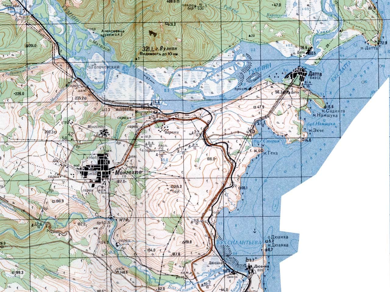 Les premiers Tu-142 de la base arrivèrent en 1979 depuis Horol…, leurs équipages et leurs familles occupèrent tous les logements vacants de Mongokhto, créant une surpopulation massive de la ville.., ils sont encore appelés “hunhuzy”, un dialecte local pour le mot russe “razboyniki” (voleurs ou pirates).