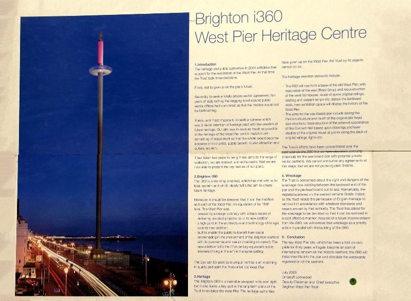Au printemps 2006, le “West Pier Trust” a annoncé un nouveau plan pour financer la restauration de ce qui restait de la jetée, couplé avec la construction d’une tour d’observation de 183 mètres (la tour i360), qui : “sera construite sur le pont promenade du West Pier et redonnera tout son éclat à Brighton“…, ce qui était sans nul doute un jeu de mot volontaire typiquement “British” eu égard à l’aspect “cierge” de cette affaire !
