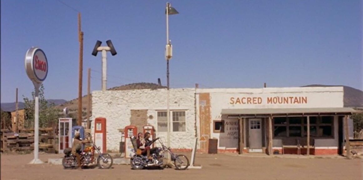 Les amateurs du classique culte “Easy Rider” se souviendront rapidement de cet endroit, c’est à la station-service de “Sacred Mountain” que Wyatt et Billy faisaient le plein de leurs Choppers. Mais tout a changé seuls quelques détails démontrent que c’était bien là… C’est dommage que ça disparaisse ! Même avec les meilleures précautions, ces choses sont inévitables. Dans ces moments-là, Jeff s’empresse de se laisser aller ses ressentis et souligne ce qui suit :