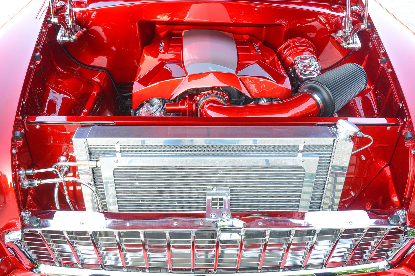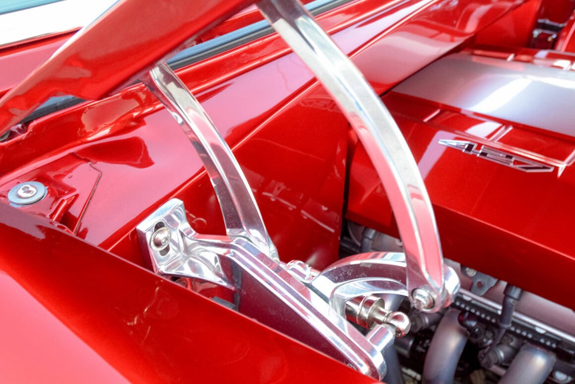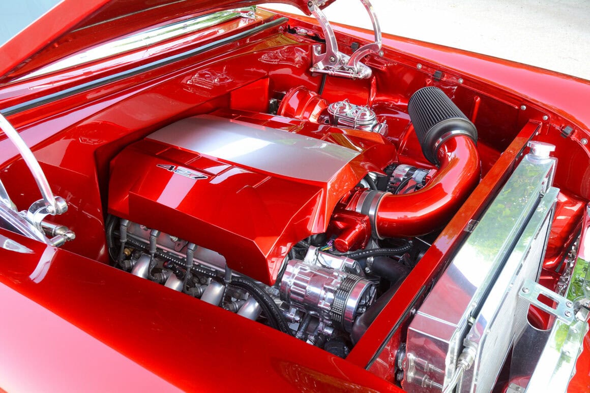 Un amplificateur Focal FDP 6.900, quatre enceintes Focal K2 de 6 1/2 pouces et un caisson de basses Focal K2 de 12 pouces sont monté un peu partout, en ce compris dans l’espace de rangement arrière). Sous la tôle d’époque se découvre un châssis complet de Art Morrison Enterprises avec suspension avant indépendante AME et barres stabilisatrices. À l’arrière, il y a un Strange Engineering Ford de 9 pouces avec des vitesses à glissement limité de 3,50, des amortisseurs avec airbags, un kit de freins Baer à disque avec des rotors de 14 pouces et des étriers à six pistons.