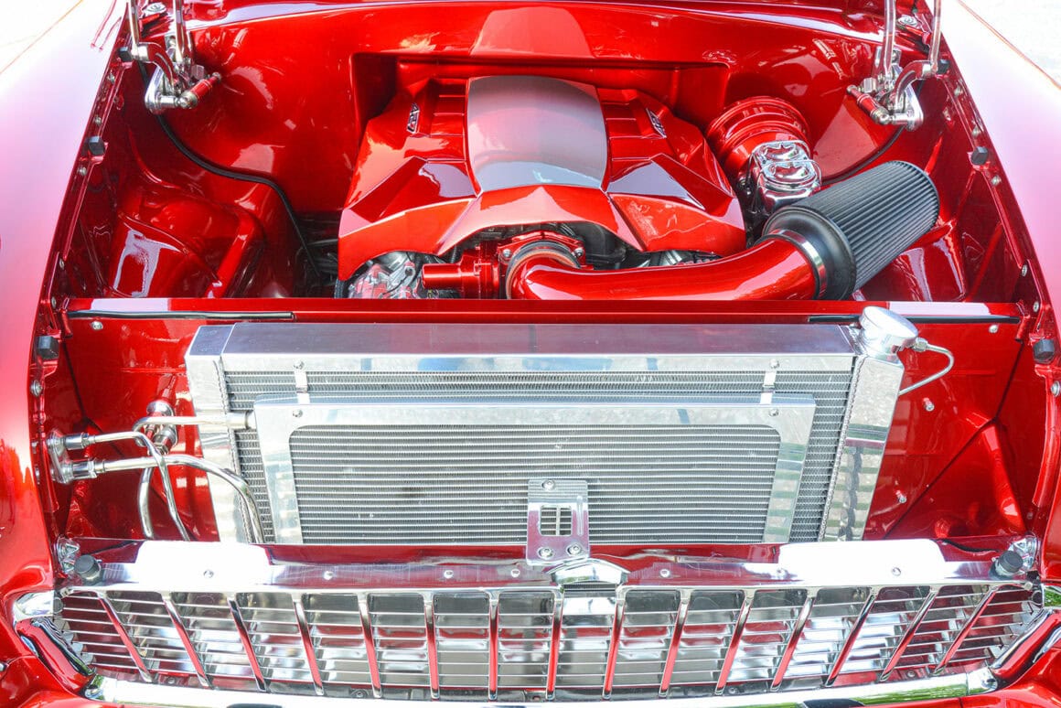 La Chevy Nomad roule sur un ensemble de jantes en trois parties Billet Specialties B-Forged 450, mesurant 18×9 et 19×12, puis soigneusement caoutchoutés de pneus Invo Nitto en 235/35R18 et 345/30R19 (et c’est beaucoup de caoutchouc)… Sous le capot, la magie est fournie par le dernier cri de Chevrolet Performance, un V8 Corvette LS7 de 7,0 L (427ci) de 530cv. Le maintien du V8 au frais est assuré par un radiateur en aluminium à trois rangées de Mattson, tandis que la sortie de la note d’échappement est une paire de tubes en acier inoxydable.