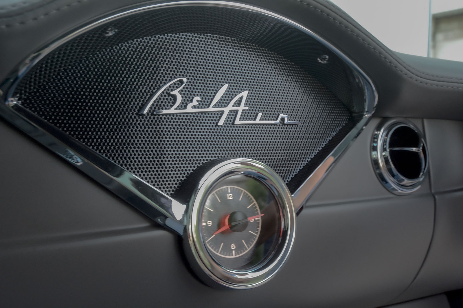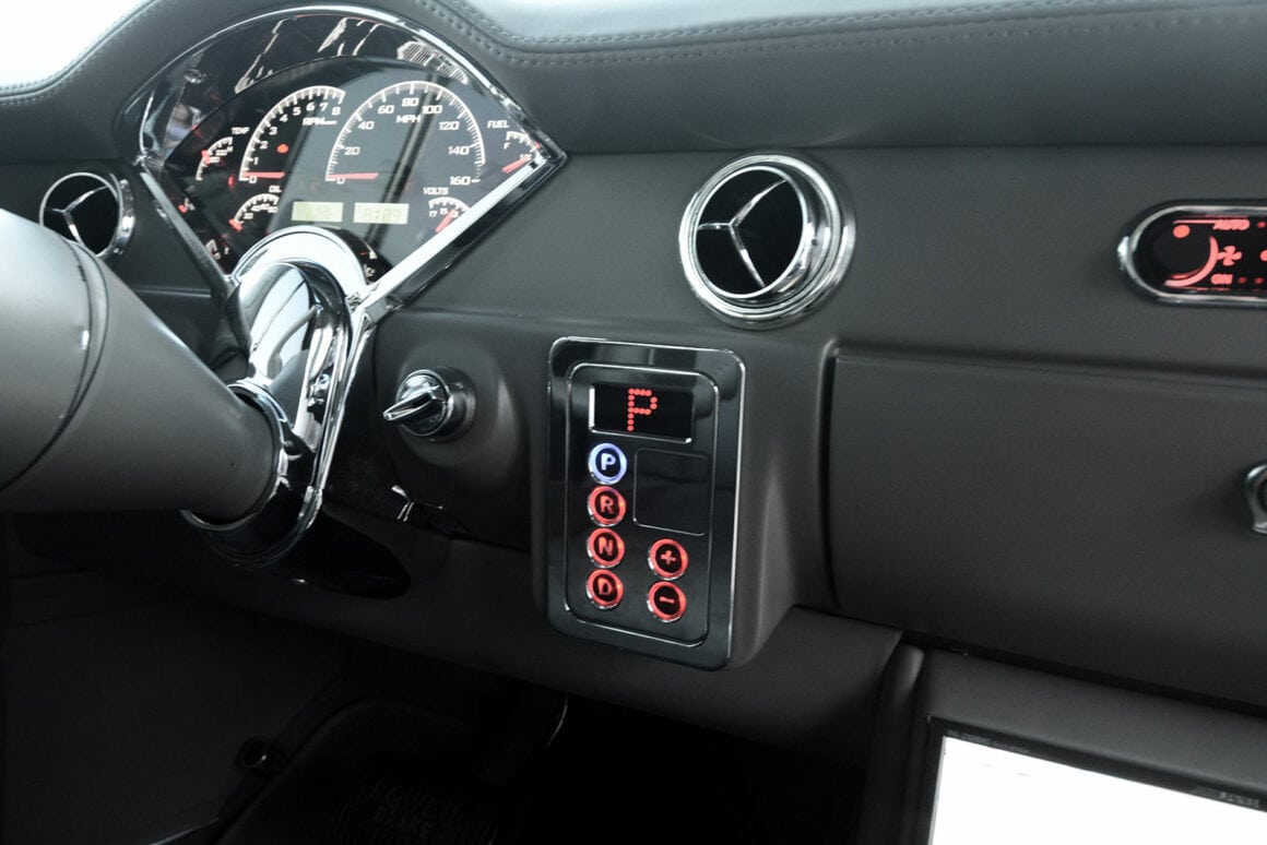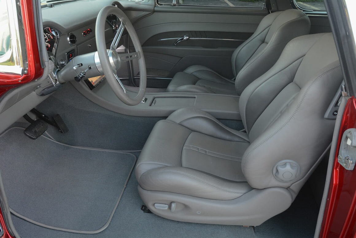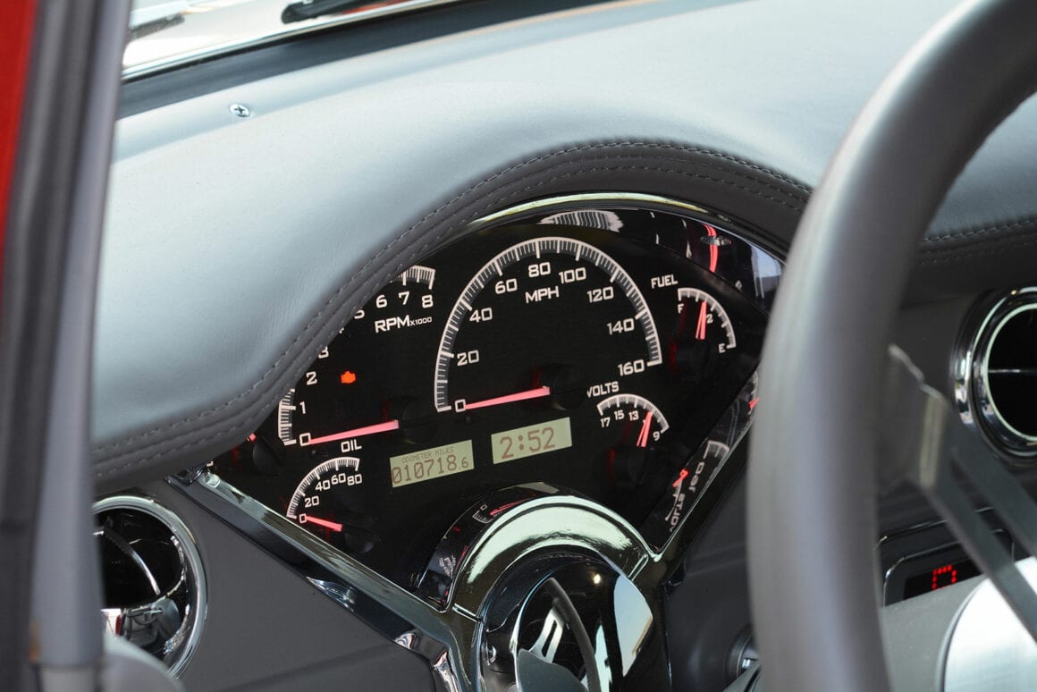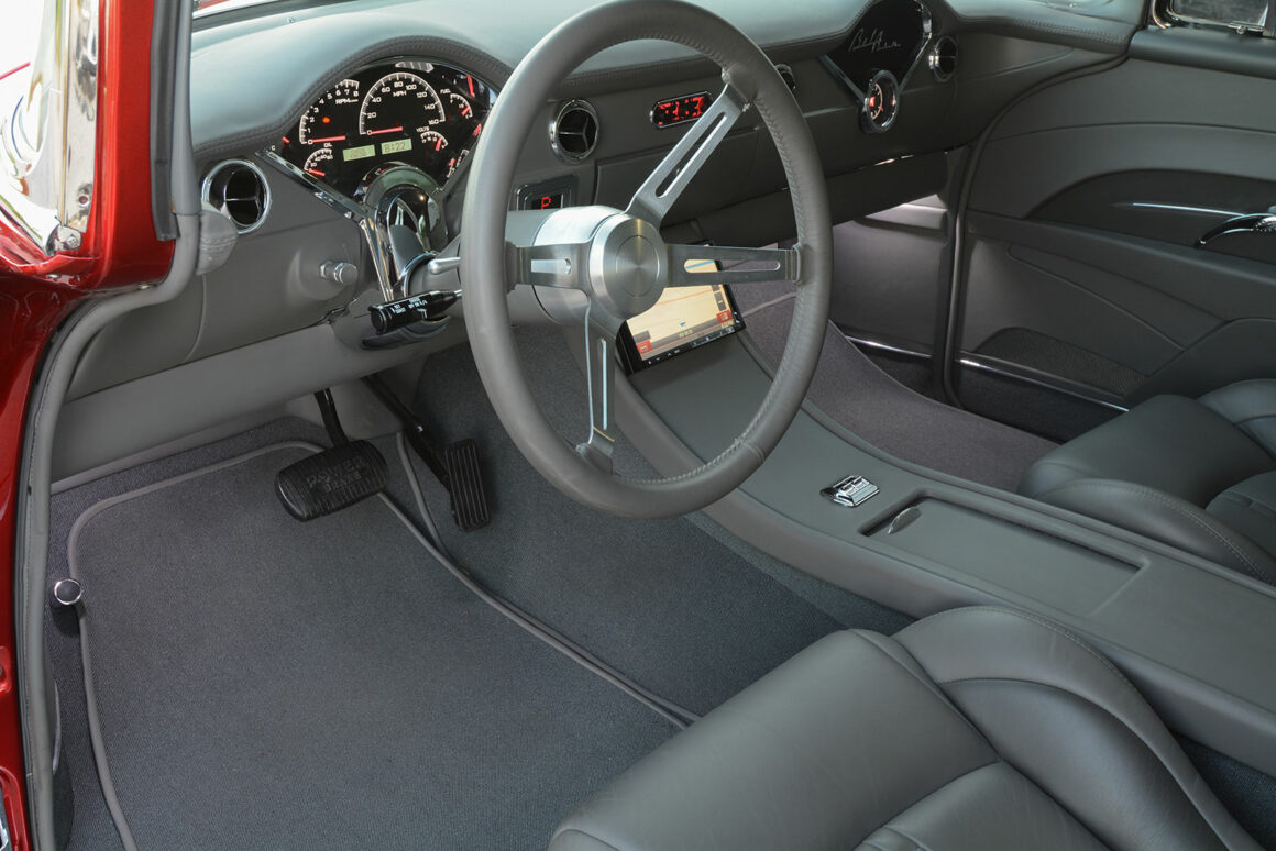 Le tableau de bord abrite des instruments Dakota Digital, les commandes y compris l’air conditionné Vintage Air AC, une horloge analogique et un levier de vitesses électronique. Il y a des sièges moelleux (en gris, cela a été dit 5 fois, la sixième est un rappel), la clim’ et l’instrumentation numérique aussi, alors pourquoi n’y aurait-il pas un GPS électronique et un système de sonorisation à jour installé par Mobile Sound Systems ? C’est le cas… La chaîne stéréo est basée sur un récepteur de navigation multimédia numérique à écran Alpine X108U de 8 pouces…