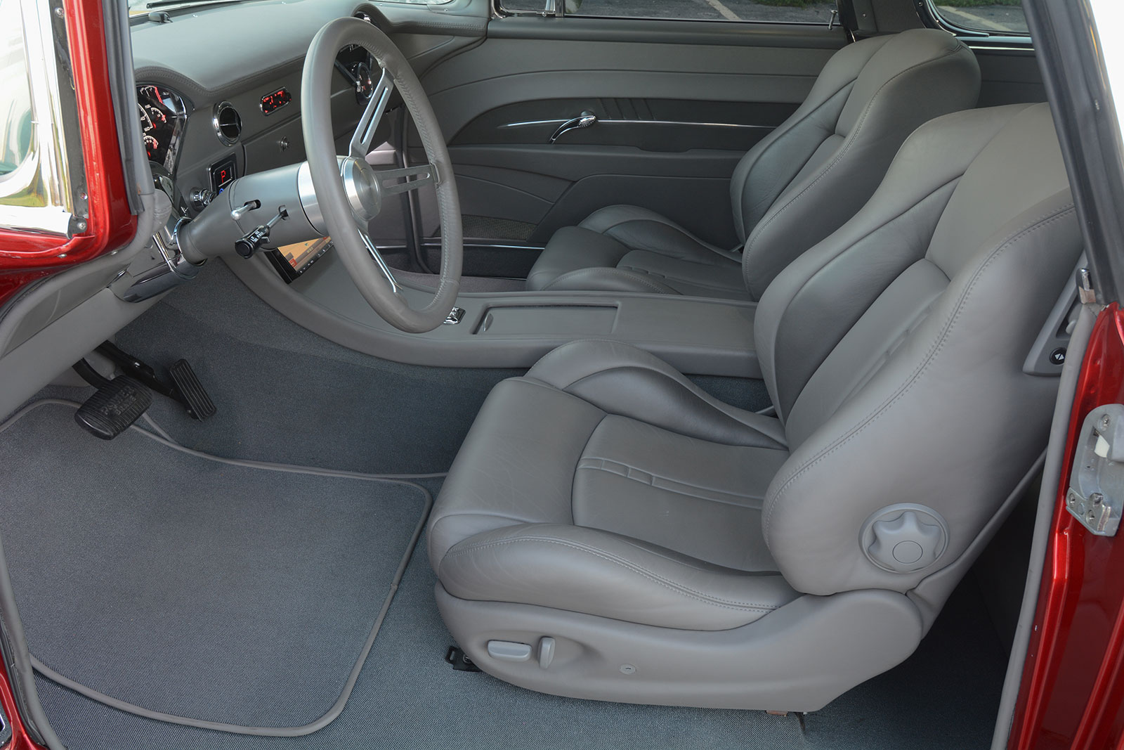 Les montants B étaient inhabituellement inclinés et l’emplacement de la plaque d’immatriculation arrière était montée sur le pare-chocs et non sur le couvercle du coffre comme les autres Chevrolet de 1955. La Chevrolet Nomad’55 de Marc a subi de nombreuses modifications, mais l’aspect de base conserve la tôle d’usine, suivie d’une grande partie de la carrosserie qui sera peinte par Bright Brothers utilisant House of Kolor Candy Apple Red. Il convient de noter que cette ’55 (comme la ’56) a le feu arrière côté conducteur qui s’ouvre sur le remplissage du réservoir.