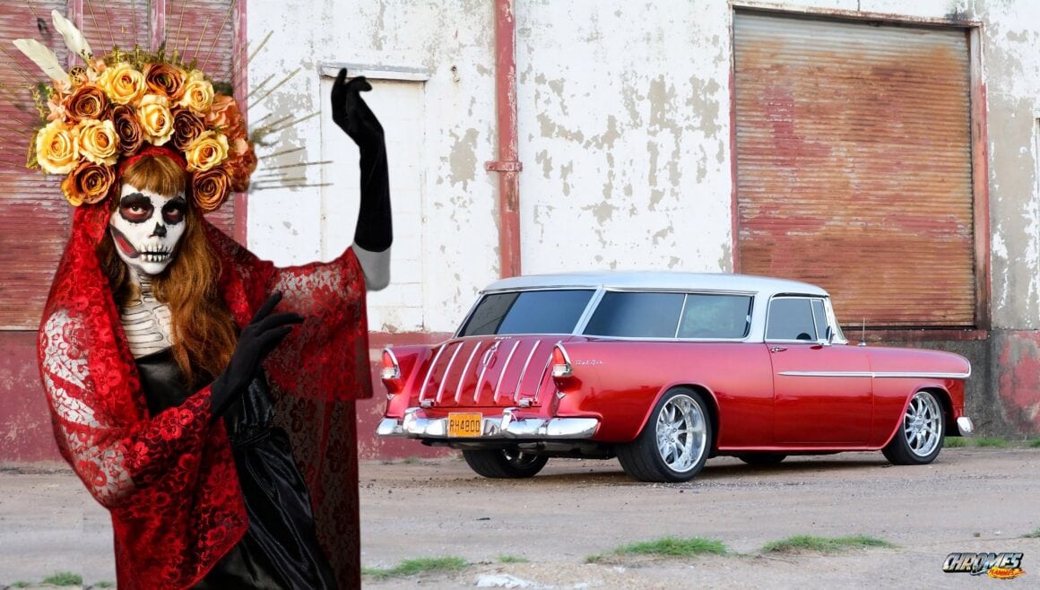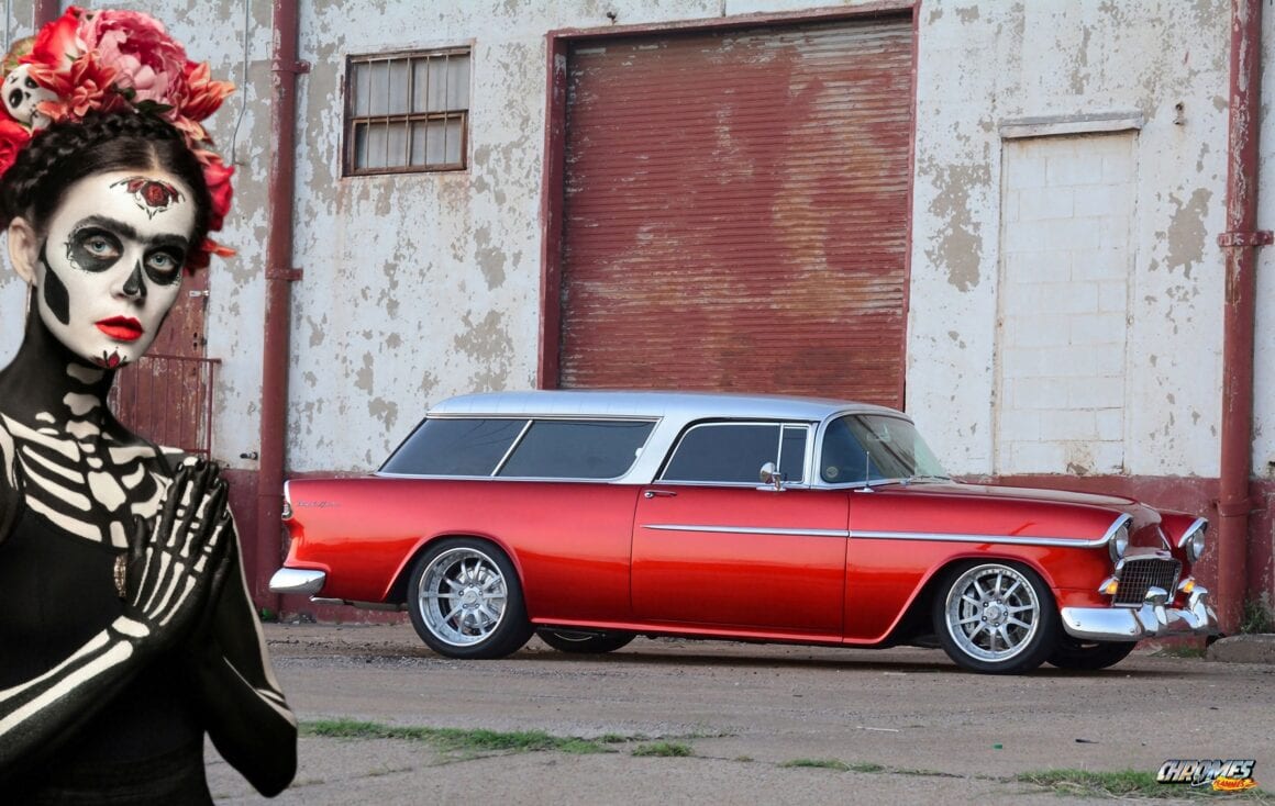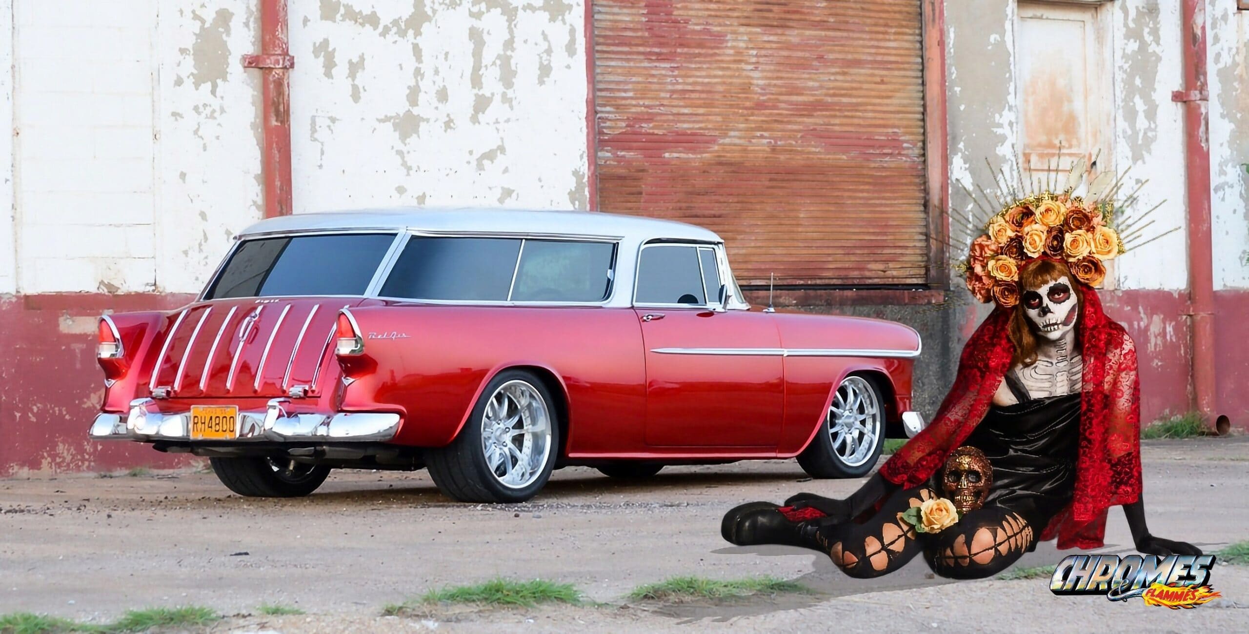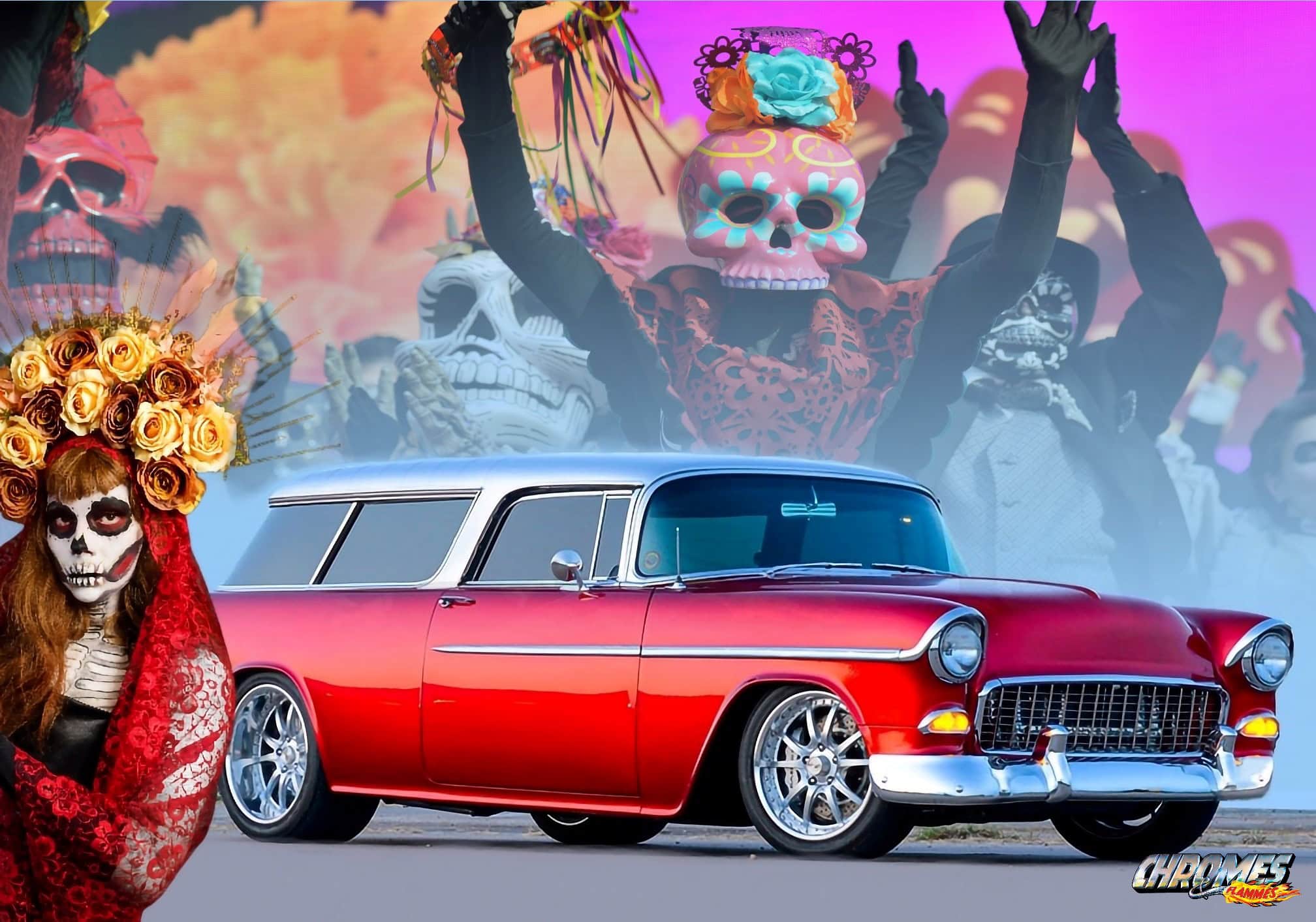 Bien, je revisse ce chapeau sur ma tête et vous invite à me suivre dans la présente nouvelle histoire qui, au départ de la Chevy-Nomad va vous faire voyager dans la fête des morts au Mexique… Vous venez de comprendre que c’est ma façon de fêter les morts du Custom et de Nitro.. Bref! Parmi les Tri-Fives, les Chevy Nomad quelle que soit l’année, ont la quotte/cote. Marc Byers, de Fort Worth, au Texas, souhaitait depuis longtemps posséder une Chevy Nomad de 1955, car c’est la voiture de ses rêves. Why not ? Certains rêvent d’une 4L, d’autres d’une Simca Versailles…