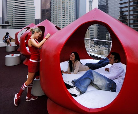 En fait, le siège de la Standard Oil s’est métamorphosé en un lieu délirant, décalé, un décor rétro-futuriste dans lequel évoluent des serveuses habillées en pom-pom girls autour de mobilier en formica sur un gazon artificiel !