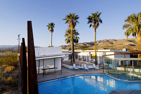 La piscine de l’Orbit Inn à Desert Hot Springs. (Éric Martin/ Le Figaro Magazine)