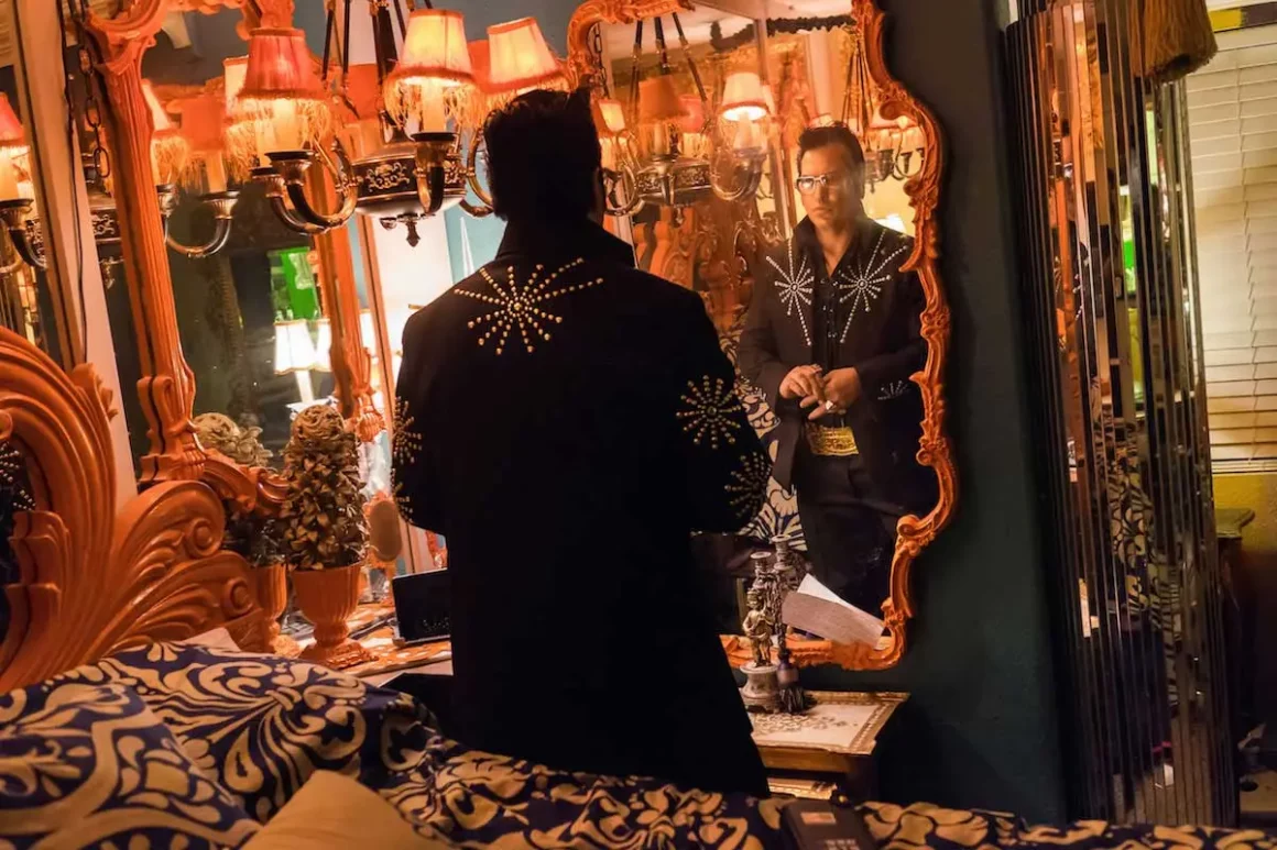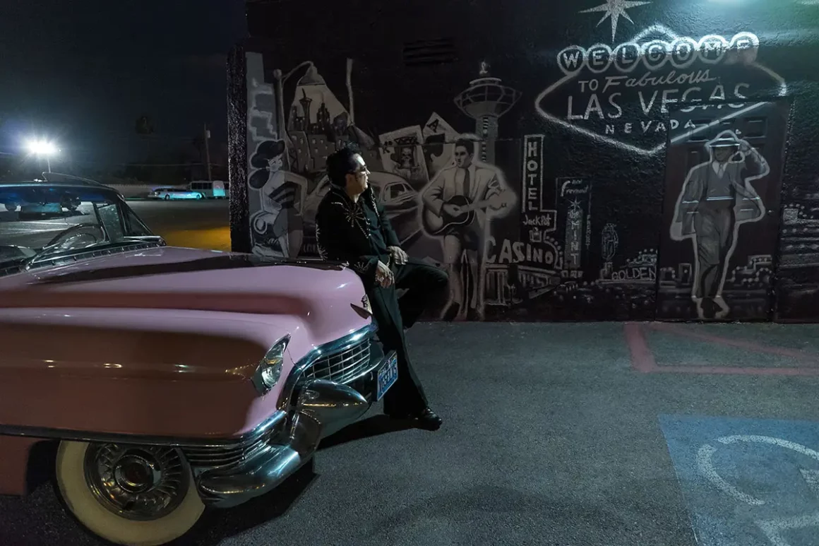 Au deuxième étage de la maison de Jesse Garon à Las Vegas, il y a un placard, le placard d’Elvis. À l’intérieur se trouvent quatre mannequins d’Elvis, six paires de lunettes de soleil d’Elvis enfermées comme des objets rares dans du plexiglas et des dizaines de tenues d’Elvis. Le vieil Elvis, le jeune Elvis, même l’Elvis militaire. Jesse enfile un jeune costume noir d’Elvis avec une boucle de ceinture en or “Assez grande pour manger un dîner de Thanksgiving”, comme il le dit. Quand il glisse sur ses pompes, il se transforme. Il est maintenant “Vegas Elvis”, roi des imitateurs de The King… Au bar, il se verse une Vodka Elvis et allume son flipper Elvis. Il me montre un album photo : Jesse en Elvis en Cadillac à Hollywood. Il est même apparu dans PlayGirl, dans PlayBoy, et a été Star dans divers films porno “Hyper-Elvis-Sex” ou il offre à la caméra chaque centimètre de son talent.