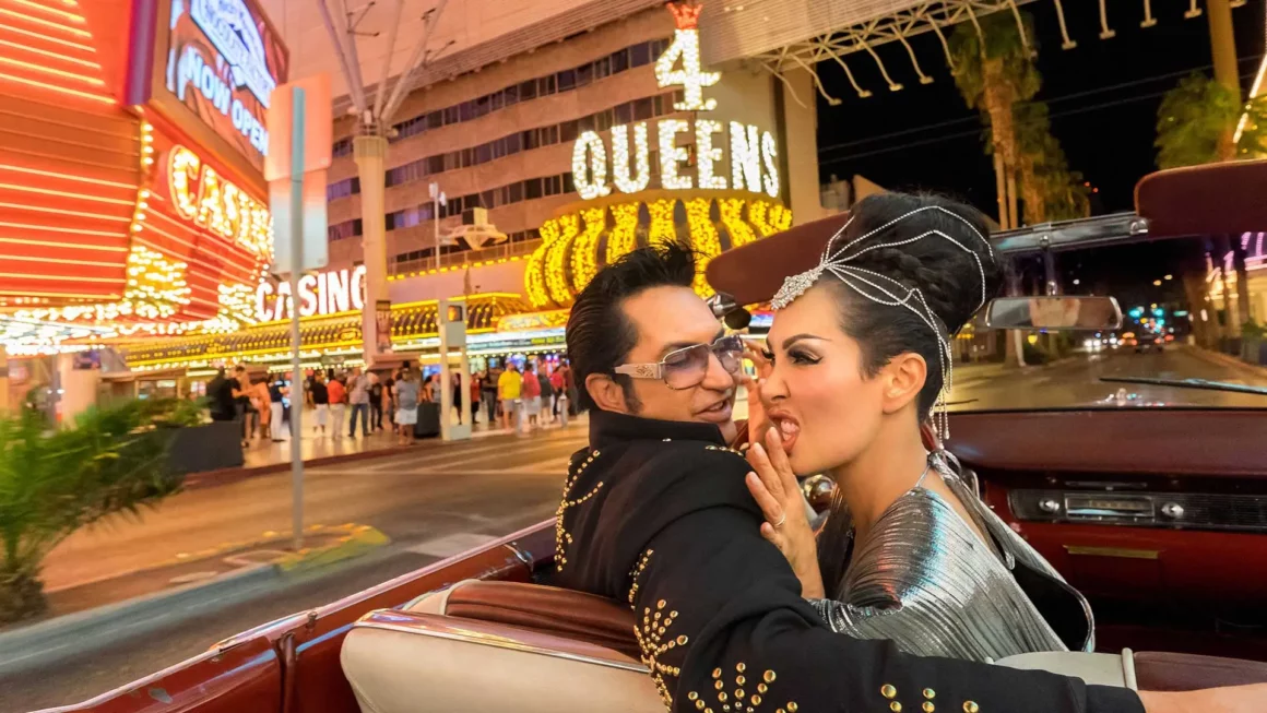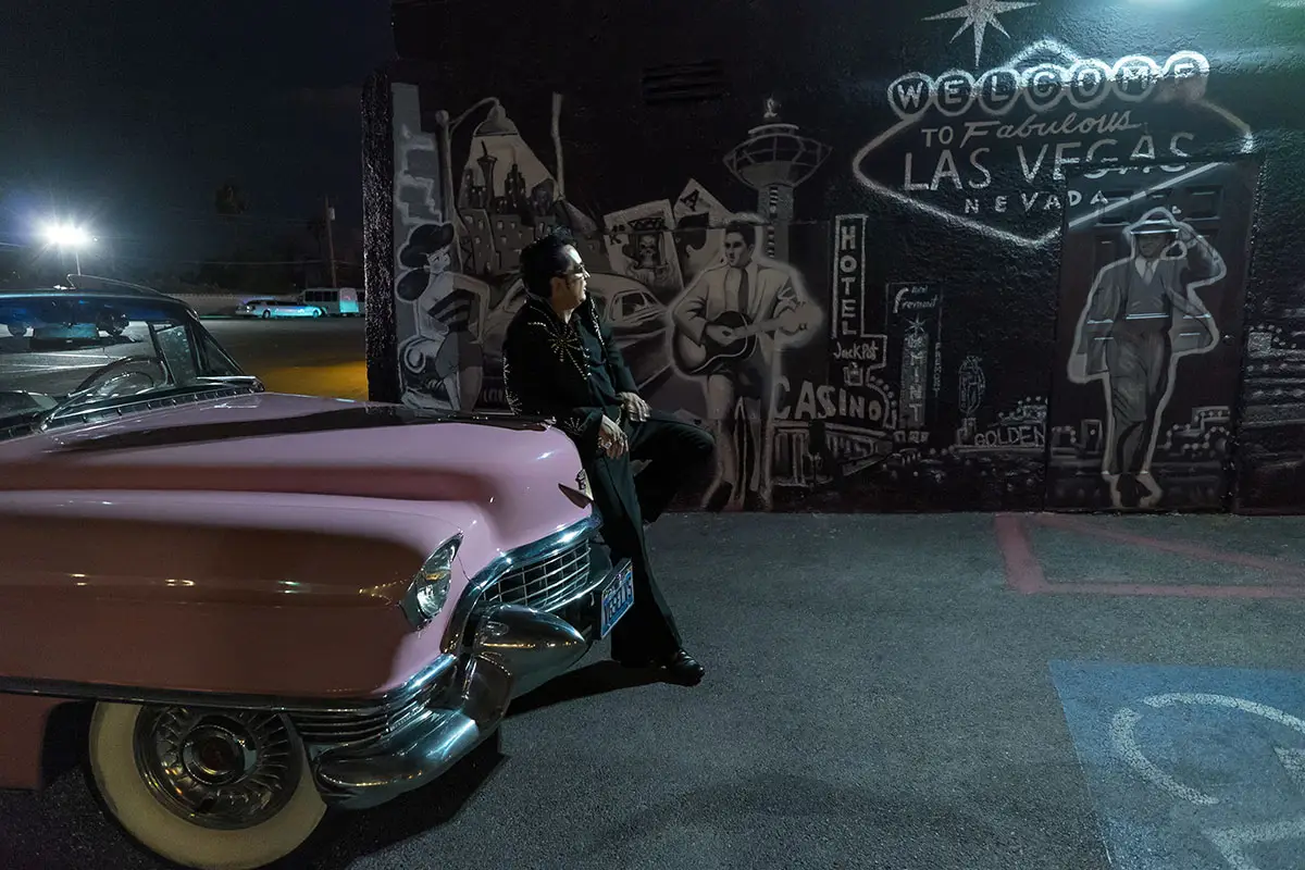 C’est Elvis Presley, juste au bon moment : “Bright light city”va mettre mon âme en feu… Viva Las Vegas! La plupart des touristes traversent Las Vegas en “Promène-Couillons”. Lorsque nous traversons le Strip dans la Caddy, la foule devient folle à voir Elvis ressuscité… Jesse salue la foule en délire tout en klaxonnant. La voiture plus toute jeune émet des bruits de craquement et vibre : “Ne t’inquiète pas” me crie-t-il au-dessus de la musique :“Cette chose pèse 2 tonnes. On ne peut lui faire de mal”…. Nous passons devant le Westgate, où le vrai Elvis vivait autrefois dans le penthouse, et le Stratosphère, ou les touristes peuvent sauter à l’élastique… Jesse commence alors à me raconter sa vie : “Je suis né à Mesquite, au Texas. Depuis que j’ai 13 ans, Elvis était le seul genre de musique que je pensais. Quand j’ai terminé le lycée, j’ai dû choisir entre l’université et Elvis. Je suis donc venu à Vegas avec 2.000 $…