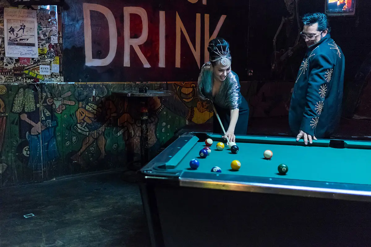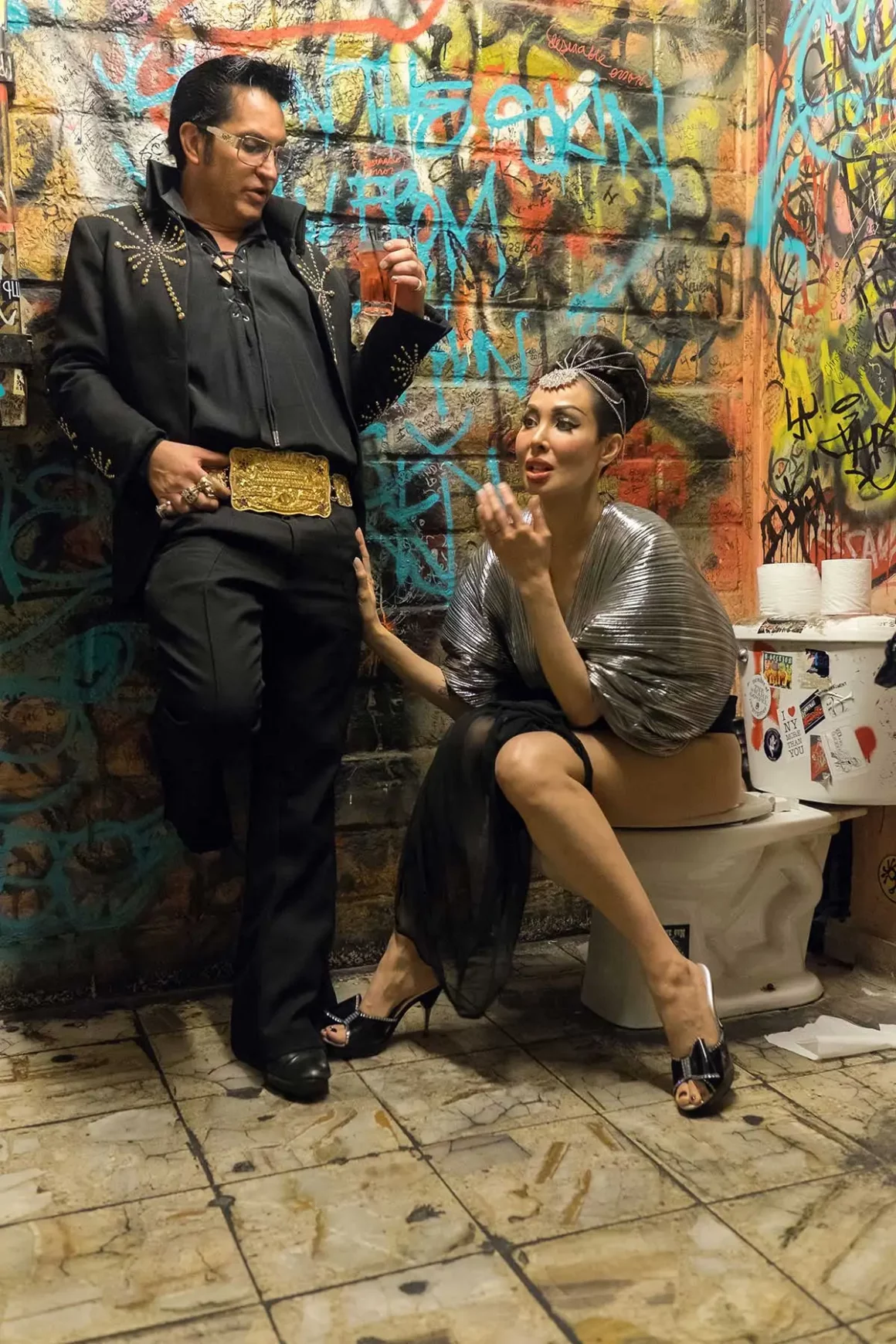 Nous accélérons et quelques pâtés de maisons plus loin on sroppe dans le parking du Double Down Saloon, la Mecque des assoiffés. Bien que cet endroit soit connu pour un cocktail appelé “Ass Juice”, nous commandons des whiskies plus civilisés. C’est ici près des tables de billard que nous prenons Kalani Kokonuts, ancienne strip-teaseuse, légende du burlesque de Vegas et engrenage furtif. C’est un Trans Hawaïen aux yeux étincelants en talons et longue robe moulante comme l’est une danseuse burlesque dans un bar de LasVegas. Kokonuts s’est produite sur à peu près toutes les scènes de la ville. Dans ses temps libres, elle chante dans un groupe de rock appelé The Pussyrammers. Elle suggère une séance photo dans la salle de bain du Double Down, une alcôve particulièrement chargée d’histoire à Sin City. C’est parti : Elvis Presley, Kalani Kokonuts, l’écrivain éméché (moi), un photographe et un videur !