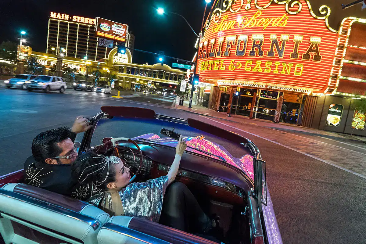 Ce sont les lieux de prédilection de Jesse. Il y a aussi Little White Wedding Chapel, une expérience drive-through où Britney Spears s’est fait atteler (sic !) et Michael Jordan aussi (re-sic !). Nous passons et demandons au préposé d’ouvrir les portes blanches “Just Married” à la sortie, pour une expérience complète. Il n’y a pas de meilleur moment que 3 heures du matin pour regarder l’art des rues. Jesse me montre ses pièces préférées : la fresque murale Rat Pack sur le côté de Koolsville Tattoo sur Las Vegas Boulevard. Il y a là le jeune Elvis, Sinatra d’âge moyen et le célèbre panneau “Welcome to Fabulous Las Vegas Nevada”… Est-ce du graffiti, ou un chef-d’œuvre digne du MoMA ? “C’est les deux. C’est le point” dit Jesse… Kokonuts est d’accord. Elle produit une fiole de tequila en forme de banane, à nouveau sur la cible… La Caddy a encore un certain nombre de destinations à me montrer.