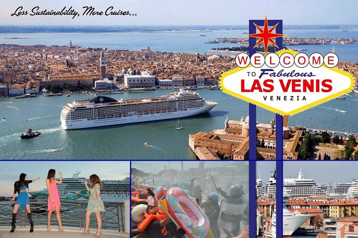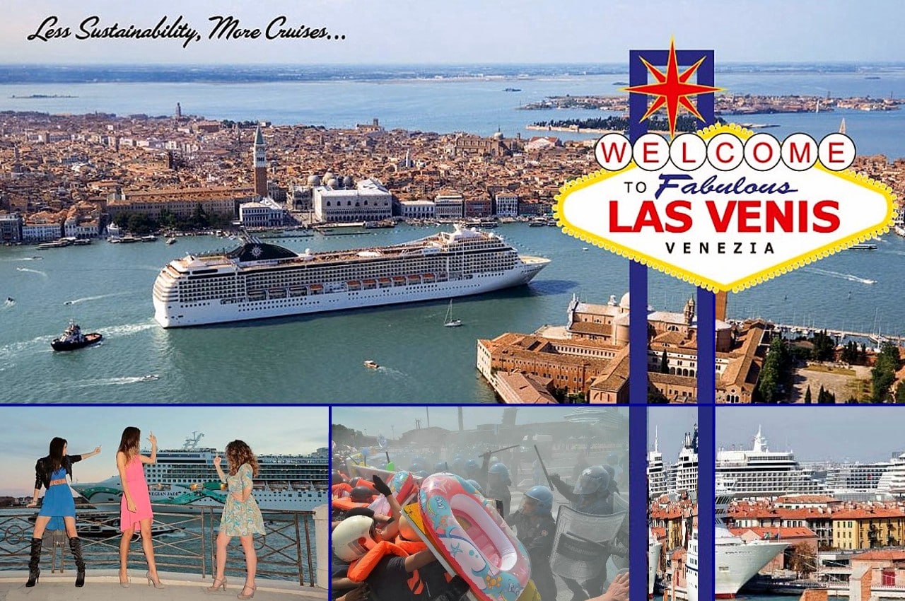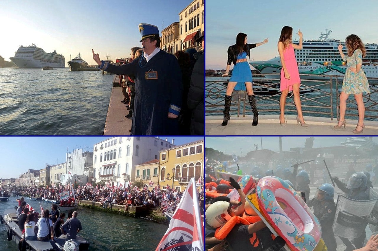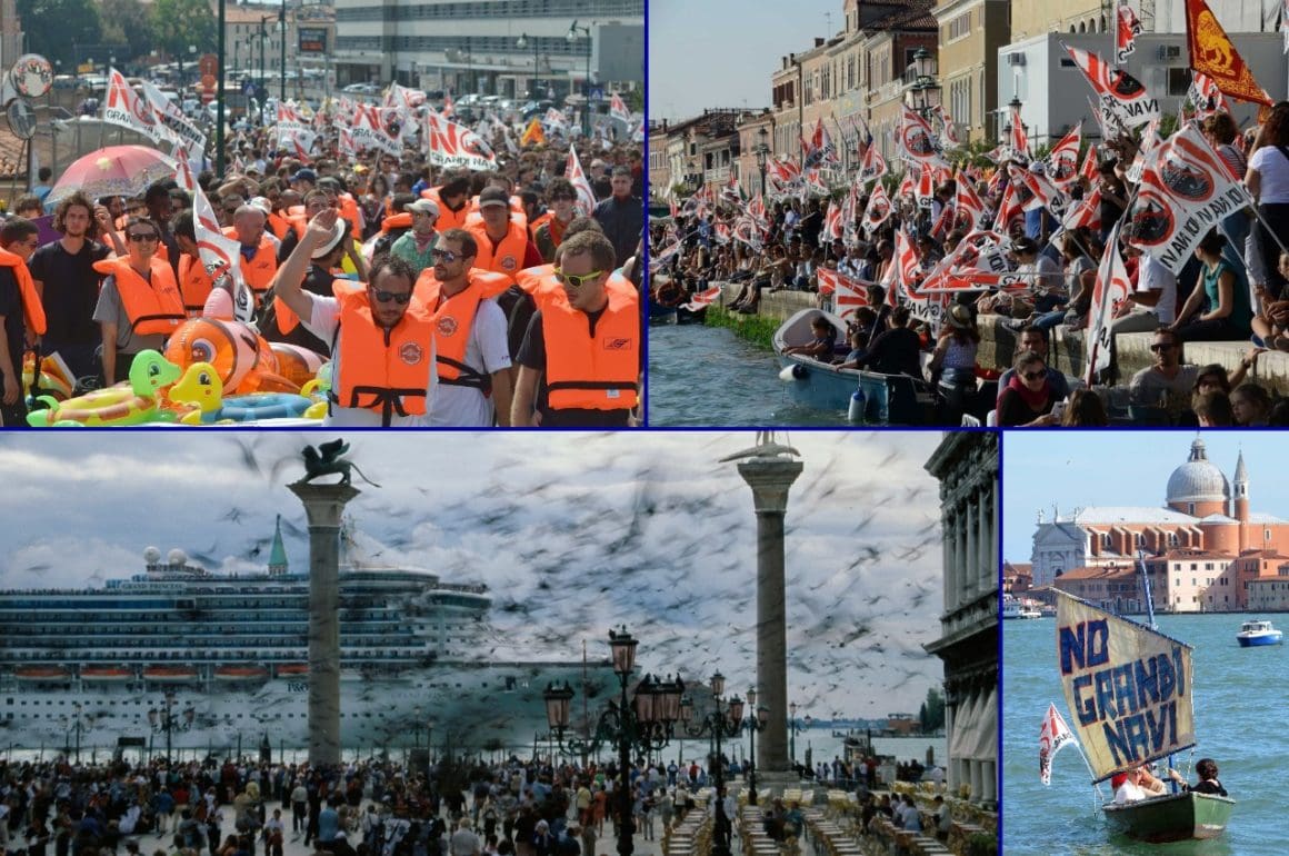 Les “grandi navi”…, les photos de ces géants des mers, qui manœuvrent à un jet de pierre de palais fabuleux soudainement nanifiés, marquent les esprits, ces monstres représentent clairement une menace pour Venise : risques d’accidents, mouvements de vase, rejets de déchets, ondes et vibrations qui attaquent la pierre et les pilotis…