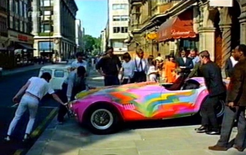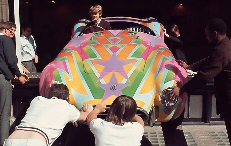 Une introduction de Tara Browne les a amenés à peindre le “Magic Piano” de Paul McCartney (qu’il utilise toujours). Au cours de l’été 1966, la COB6017 a subit sa transformation multicolore. La publicité qu’elle reçut fut telle qu’en septembre, elle fut exposé à la Robert Fraser Gallery de Duke Street, Mayfair, en tant qu’œuvre d’art à part entière. Faire entrer la voiture dans la galerie fut un défi car elle ne passait pas par la porte d’entrée. La seule option était d’enlever le verre de la fenêtre de la galerie et, avec l’aide de plusieurs hommes forts, de manipuler la voiture sur une paire de planches de bois fragiles, au-dessus du mur avant et du côté opposé. Tara Browne était assis au volant pour diriger. La façon dont la voiture et le conducteur ont survécu indemnes est un mystère.
