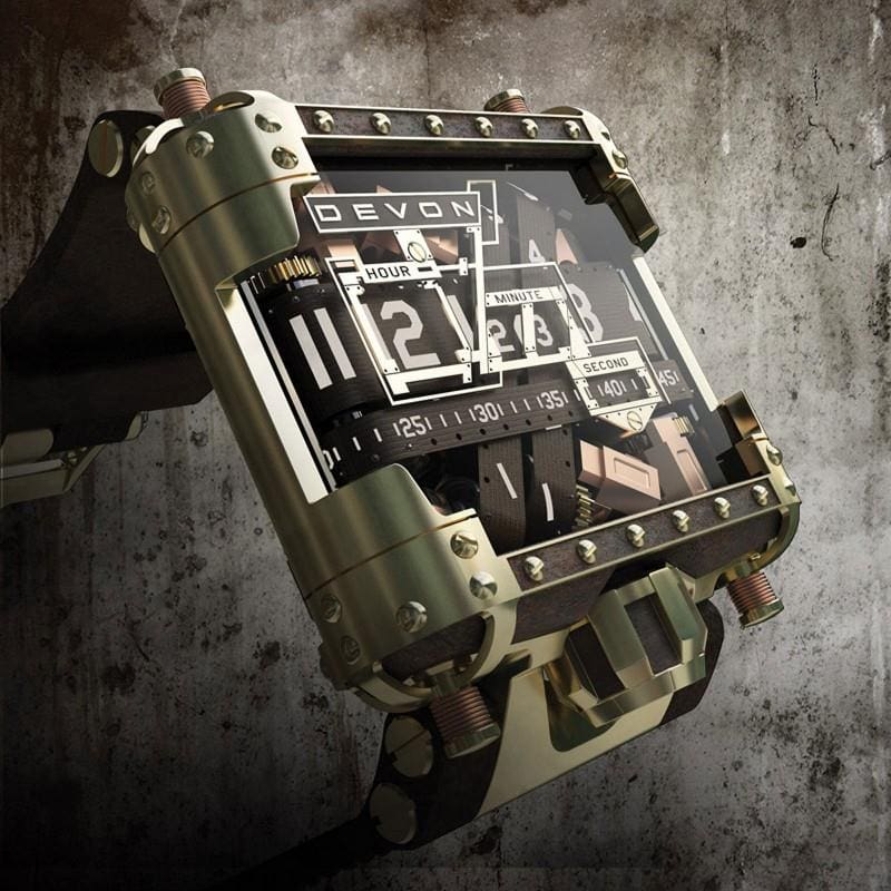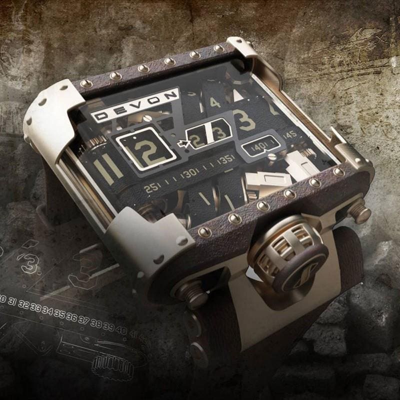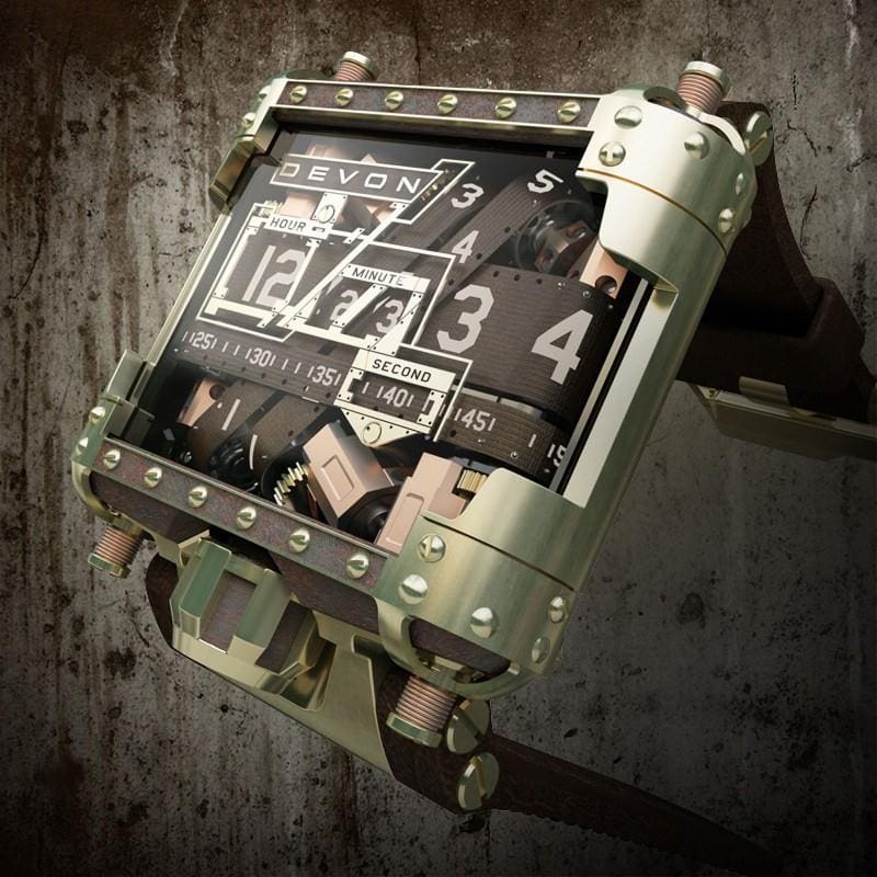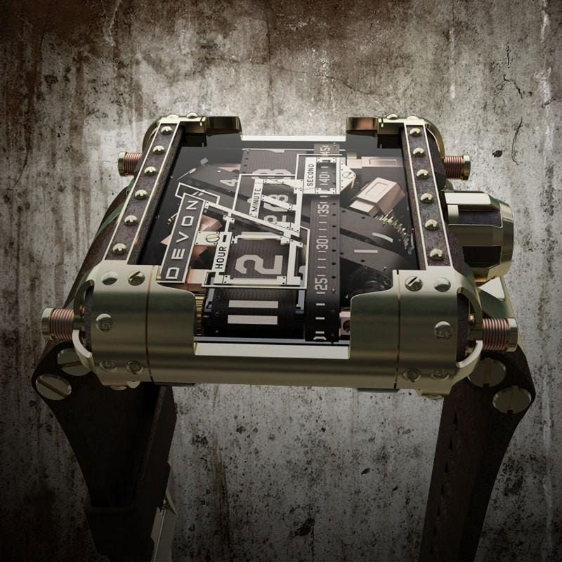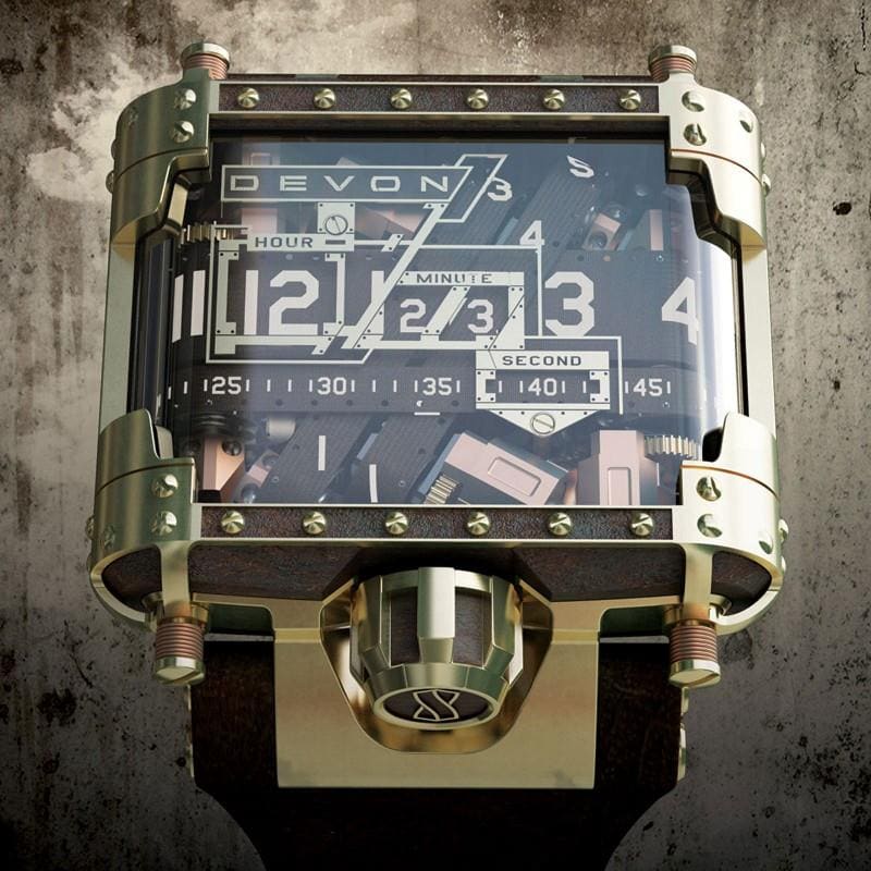La Devon qui s’affiche à 25.000 euros est une montre à bandes de roulement…, un véritable écran hypnotique ! Quatre moteurs microstep extrêmement compacts conduisent le mouvement de quatre bandes montées sur un châssis central qui permet le dégagement parfait des pièces en mouvement et crée également l’illusion que les pièces sont flottantes dans le boîtier.