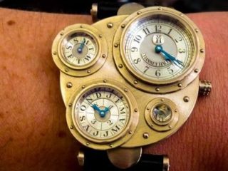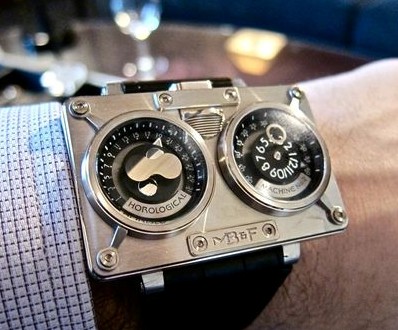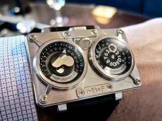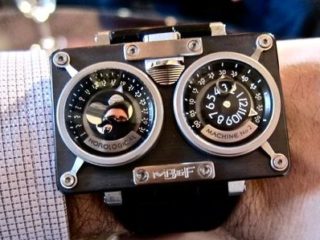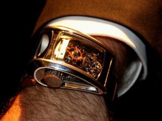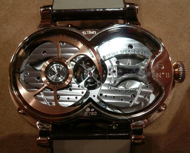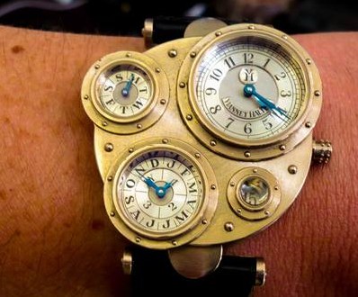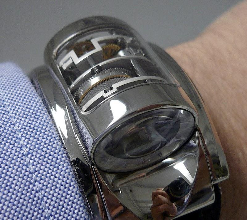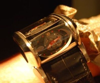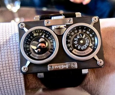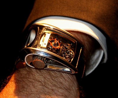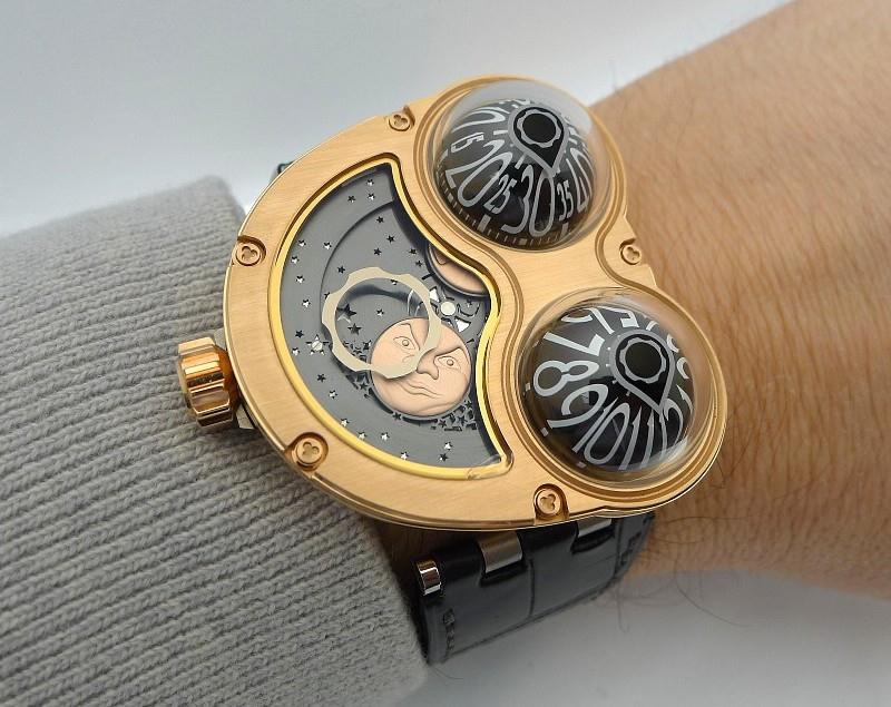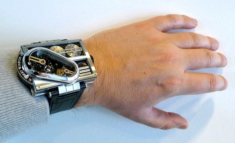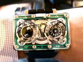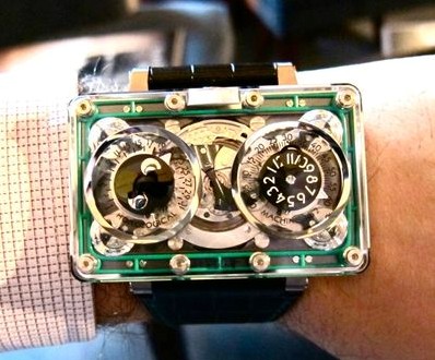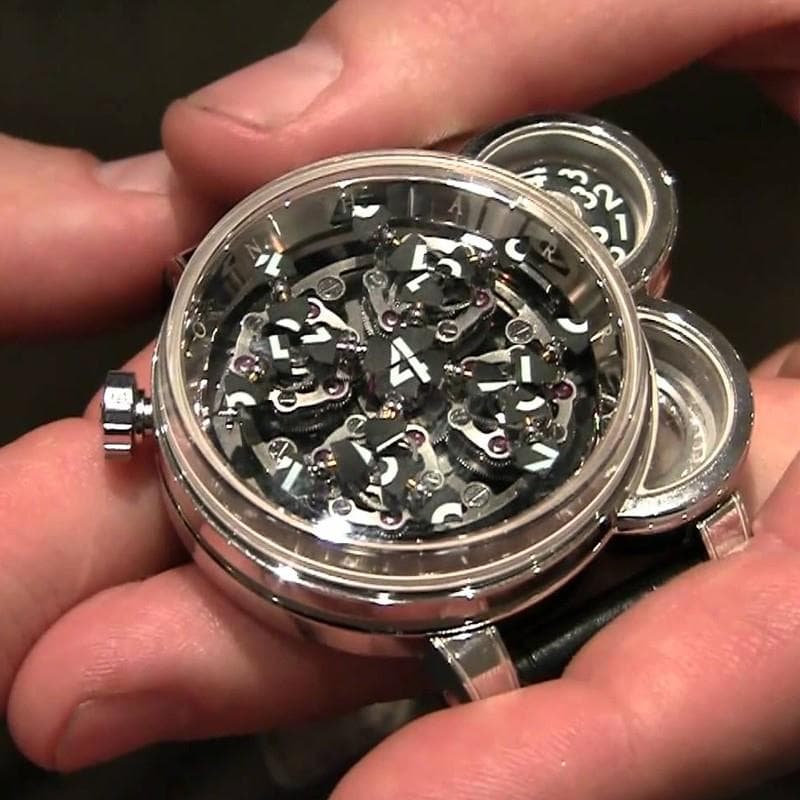 Cette montre inventée par un français, Denis Guignet, comporte 5.066 pièces, et demande entre 4 et 5 semaines de travail à un artisan-horloger pour en assembler une seule… son prix est de 209.500 euros… par rapport à ses concurrentes, cette montre est originale en ce qu’elle n’affiche rien d’autre que l’heure et les minutes, là ou d’autres accumulent volontiers des informations diverses : calendriers, fuseaux horaires, chronomètres, profondimètres… il en a été fabriqué exactement 111 exemplaires, onze d’entre elles, serties de diamants, sont encore plus chères (jusqu’à un million d’euros)… l’idée de base de cette montre est de déstructurer le temps, ce qui se traduit par un affichage original des heures…, impossible de l’expliquer précisément…