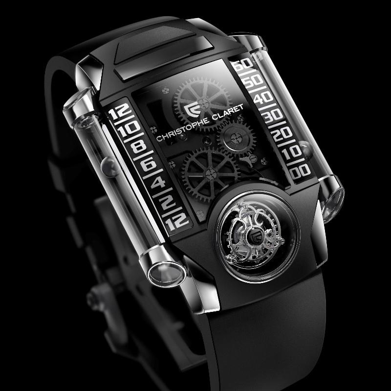 La X-TREM-1 de Cristophe Claret, qui s’affiche à 300.000 euros est une prouesse technique et esthétique avec un tourbillon volant incliné à 30°, monté sur une platine en titane curvexe en trois dimensions, doté d’un système d’affichage (heures et minutes).. la résistance du fil a été testée à la Manufacture Claret sur un système en accéléré correspondant à 6 ans de fonctionnement.