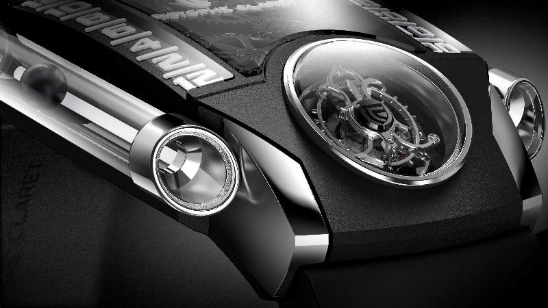 2 sphères d’acier évidées, isolées dans des tubes en saphir placés à gauche et à droite de la carrure, se meuvent de manière mystérieuse, sans aucune connexion mécanique, grâce à des champs magnétiques…