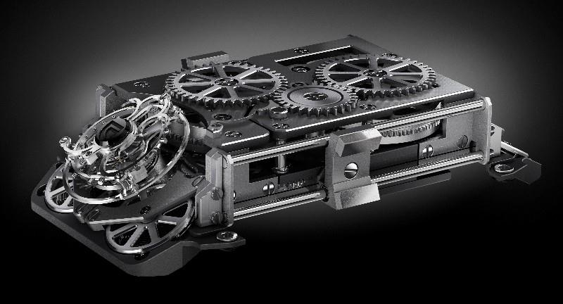 La montre, à remontage manuel, est alimentée en énergie par deux barillets…, une nécessité en l’occurrence, car ils permettent l’utilisation d’un affichage gourmand en énergie sans perturber la marche du tourbillon, et donc de la montre…