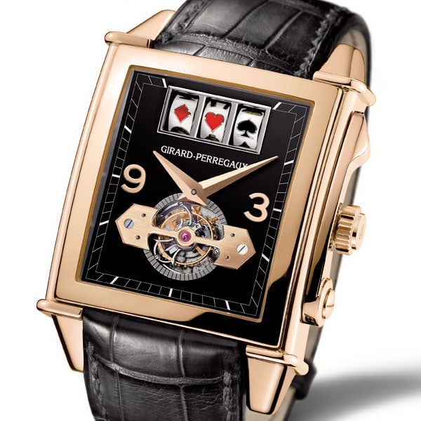 Dotée d’un fond transparent qui ouvre sur le mouvement, la Vintage 1945 Jackpot Tourbillon illustre la maîtrise extrême de Girard-Perregaux en matière de garde-temps rares et précieux.