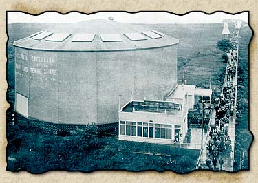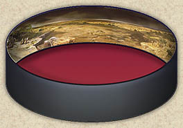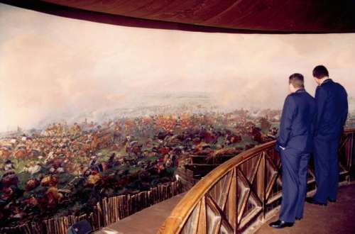 Les visiteurs gravissent un escalier et pénètrent dans une vaste enceinte où se trouve le “Cyclorama“, lequel se déroule sur une surface murale continue de toile peinte.