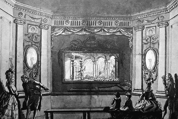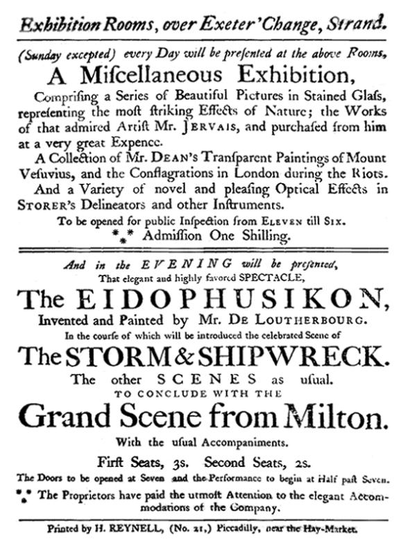 Si Daguerre introduisit le mouvement ou plus exactement l’animation dans les images fixes par l’utilisation savante de la lumière, ou si l’on veut l’imitation de l’action des éléments de la nature dans un art s’apparentant au départ à la peinture, la paternité de l’idée, sinon celle des solutions techniques les plus adéquates, revient à un autre praticien du décor de théâtre, Philippe de Loutherbourg, né à Strasbourg en 1740 et devenu chef-décorateur du Théâtre-Royal de Drury Lane dans les années 1770 : il créa avec son “Eidophusikon” l’une des premières véritable machine à spectacle total.