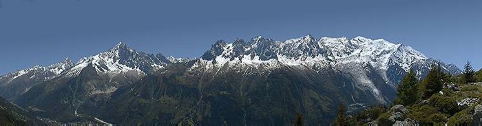 Cette image panoramique de la chaîne du Mont Blanc, prise depuis Plan Praz (le Brévent)