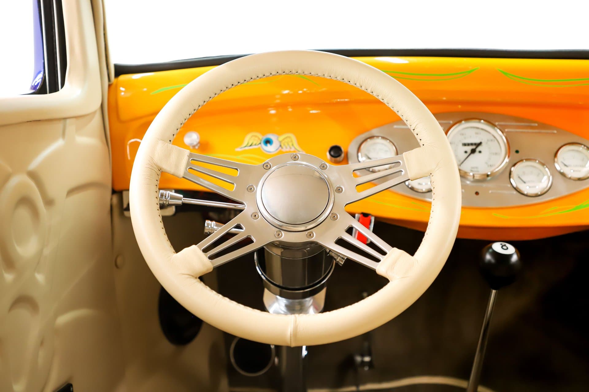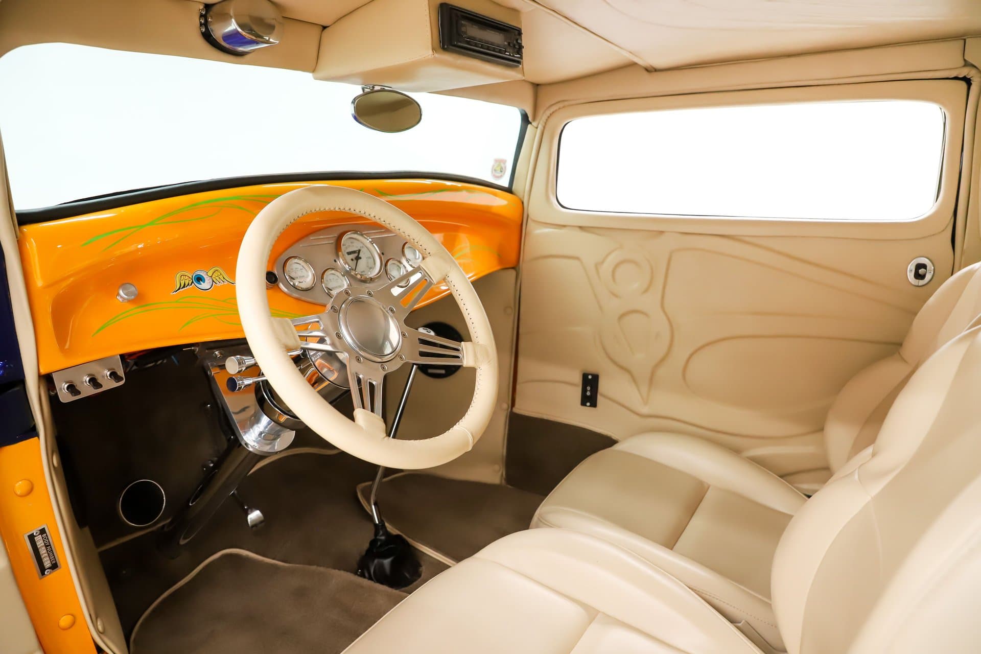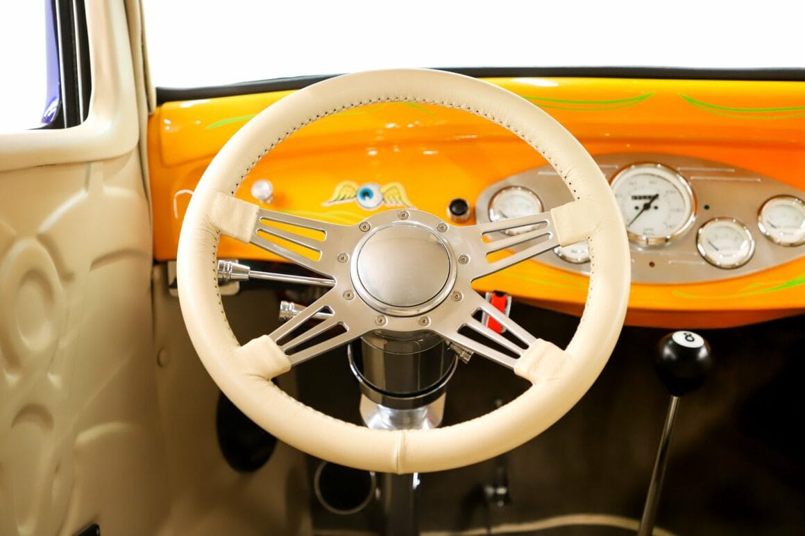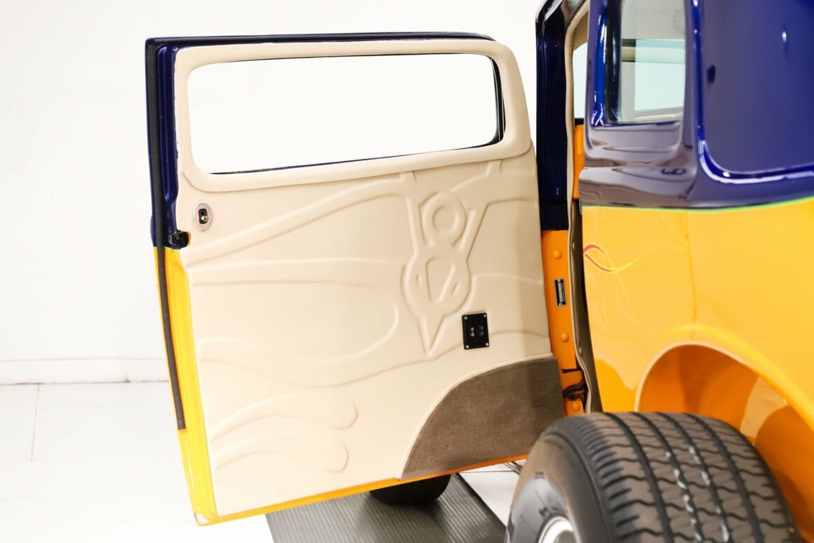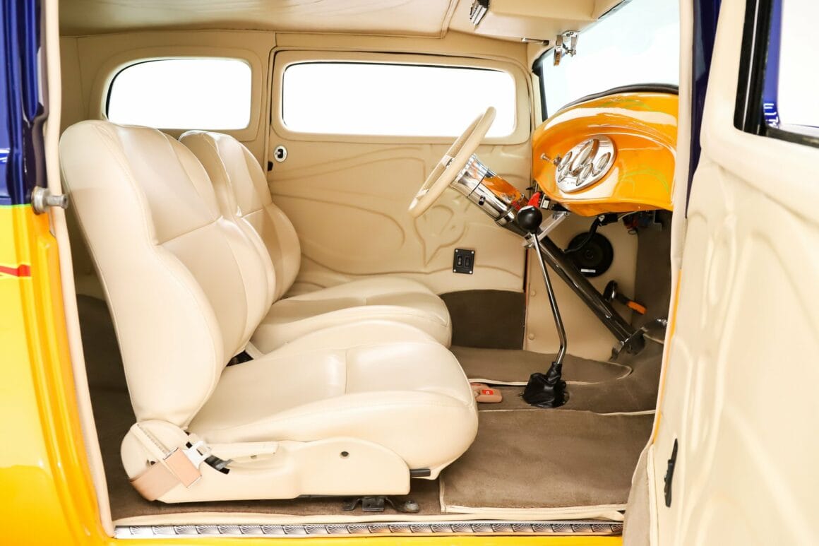 INTÉRIEUR: C’est un confortable Hot-Rod 2 places. Tout l’intérieur est rembourré. Les motifs gaufrés personnalisés sur la garniture de toit et les panneaux de porte sont Top ! Les sièges baquets sont inclinables et le plancher n’est pas en planches de bois mais recouvert de moquette d’avant en arrière. Pas de coffre mais il y a beaucoup de place derrière les sièges, on peut y loger des gamines pubères ou des chiens et chiennes. Un jeu de compteurs assortis se situent dans une lunette de billette. La colonne inclinable polie a un volant de luxe enveloppé de cuir assorti. Il y a un shifter Lokar au sol et une chaîne stéréo au plafond avec 4 haut-parleurs dans les panneaux latéraux. Les fenêtres sont électriques.